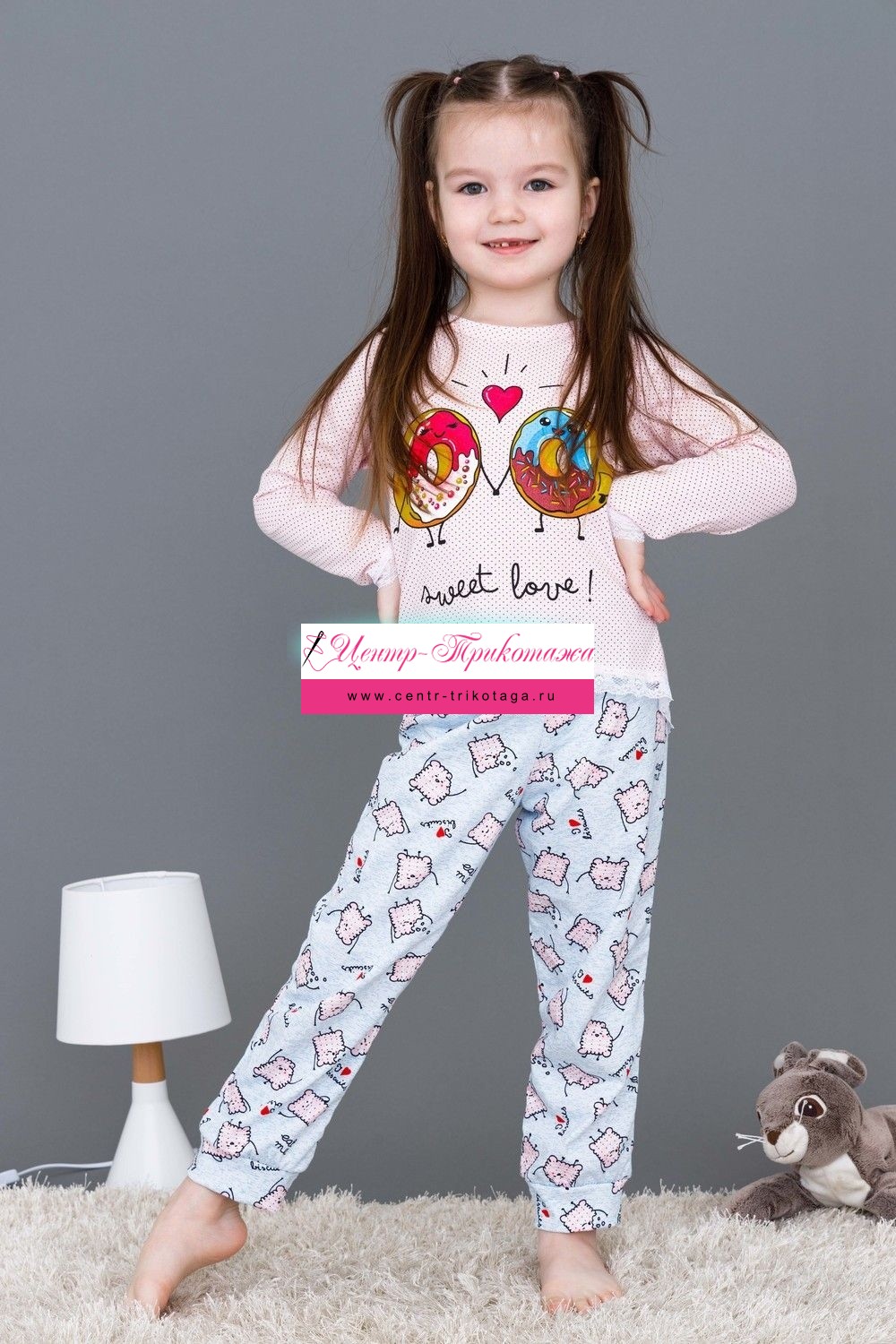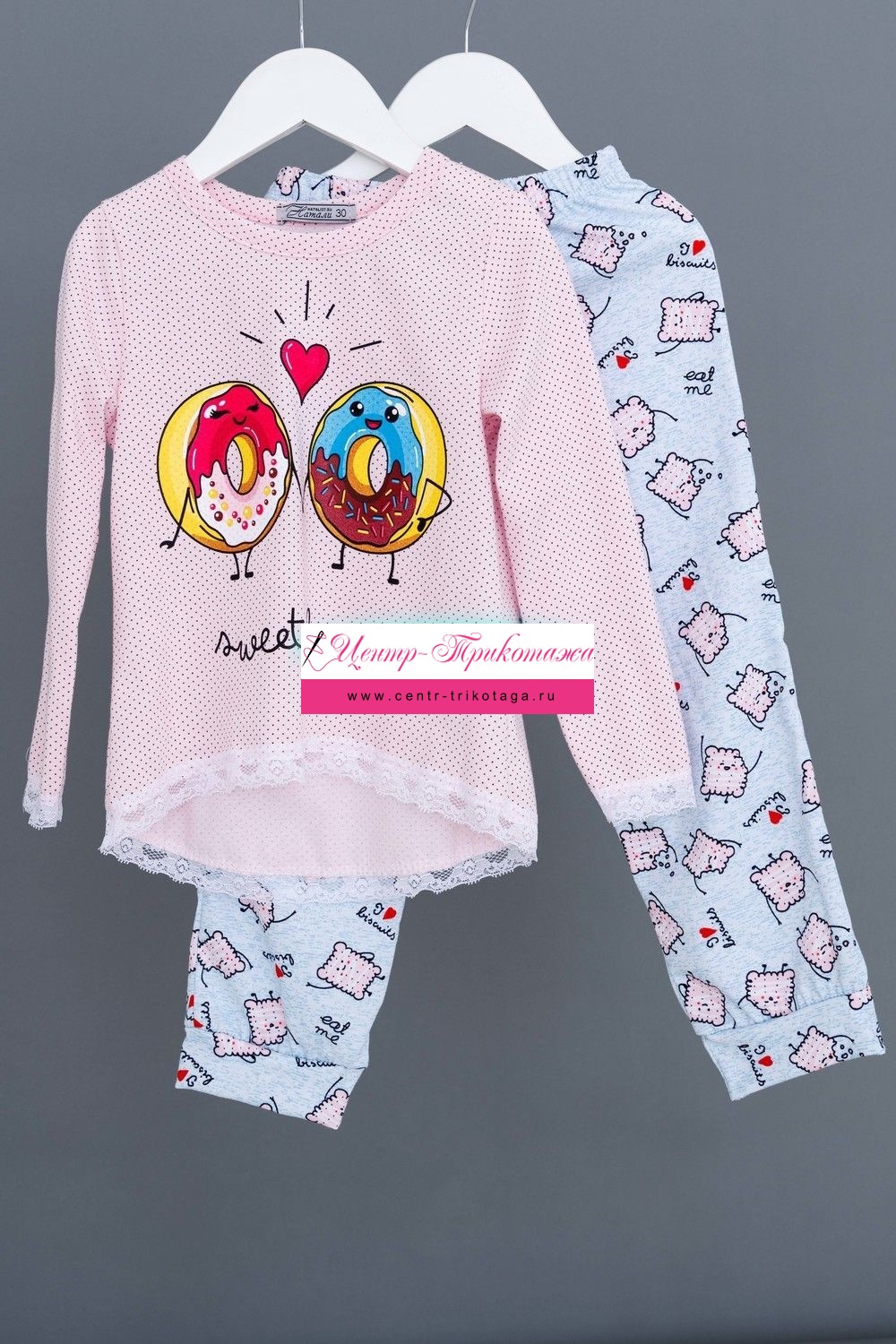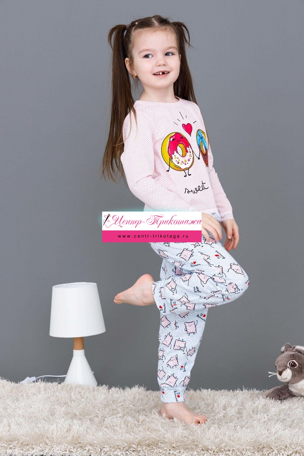 Пижамка детская со сладкой печатью! Изготовлена из гипоаллергенного трикотажа, хлопок не электризуется и обеспечивает циркуляцию воздуха. Пижама свободного кроя, не ограничивает движения. Кофта с длинными рукавами, низки и рукава отделаны мягким кружевом. Штанишки на манжете. На примере пижамы 50506 можно увидеть как выглядит маленький размер. Размерная сетка обеих пижам идентична.