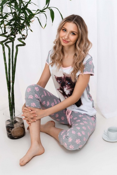 Пижама из кулирки футболка + бриджи. Светлая футболка с розовой окантовкой, принт в виде котят, серые вставки с кошачьими следами. Серые бриджи с узором в виде следов, розовая окантовка карманов, шнурок на поясе, длина чуть ниже коленей.
