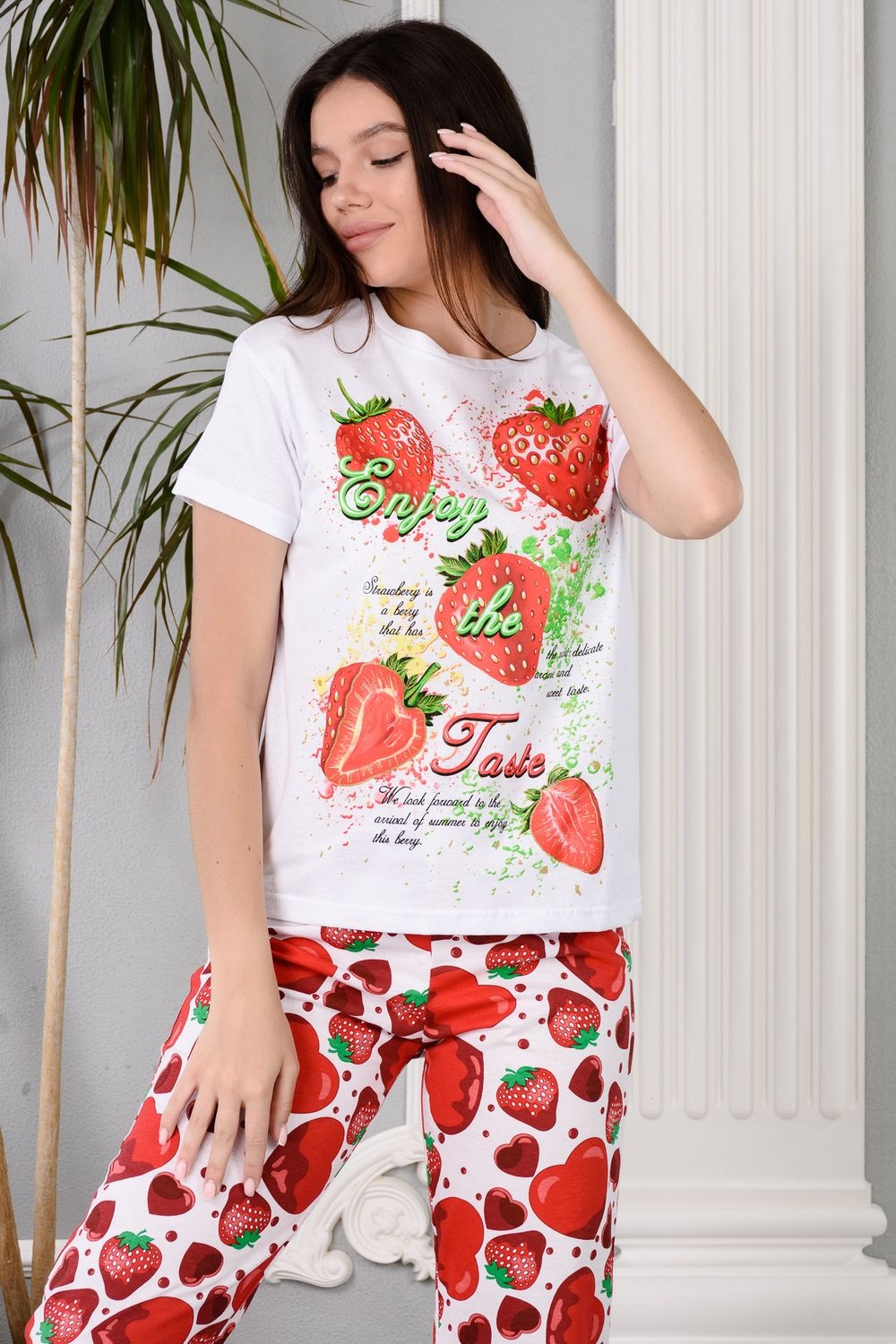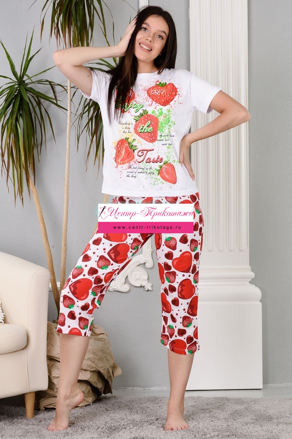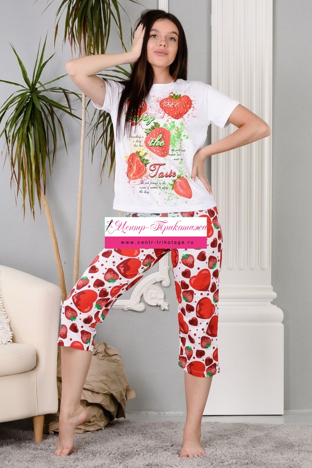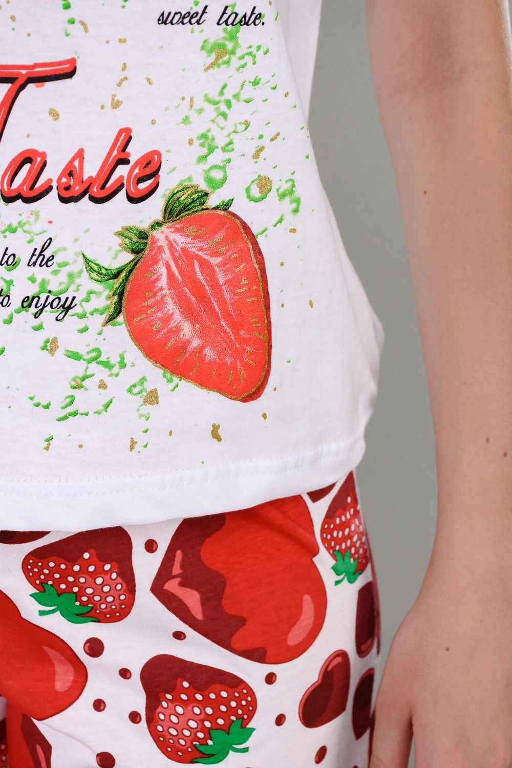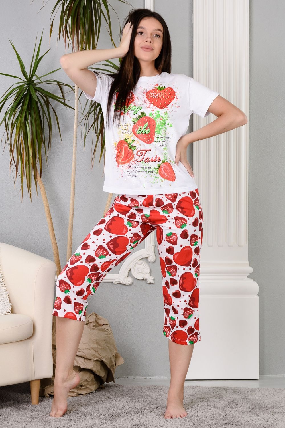 Уютная клубничная пижамка. Футболка со спущенной линией плеча, бриджи свободного кроя. В этой пижаме удобно спать, проводить время дома и на отдыхе.