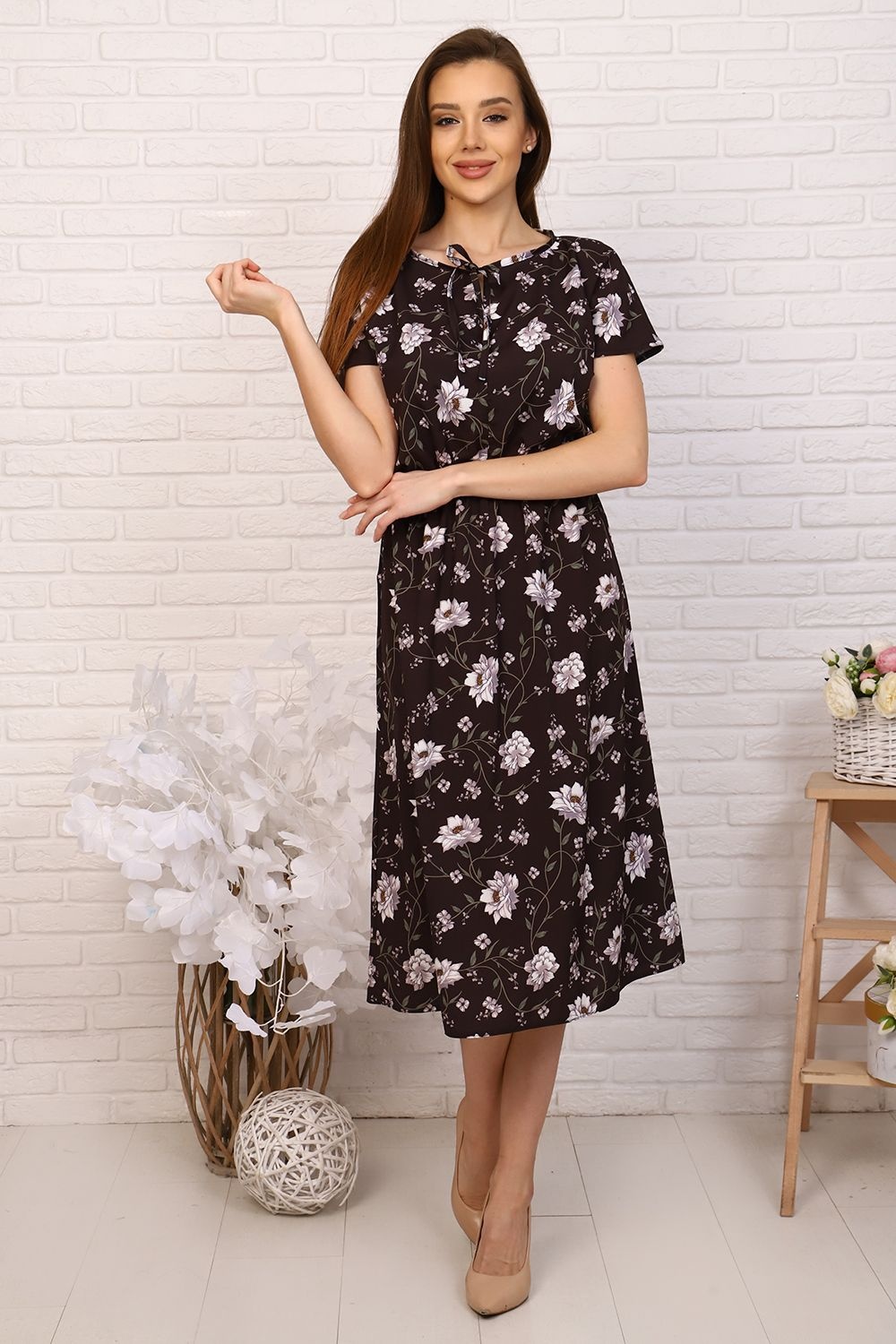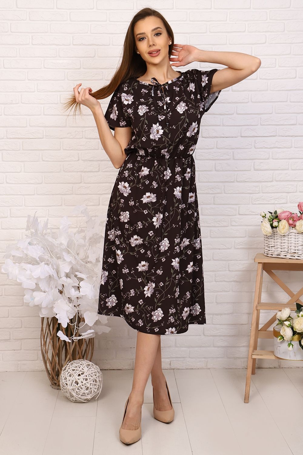 Летнее лёгкое платье из тонкой ткани с цветочным принтом. Модель длиной чуть ниже колена, отрезная по линии талии, с напускным верхом и коротким цельнокроеным рукавом. В поясе мягкая резинка. На округлой горловине небольшой вертикальный разрез на завязках. Удобное платье на каждый день.