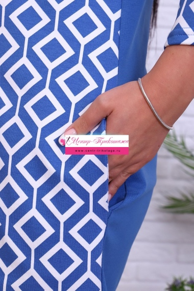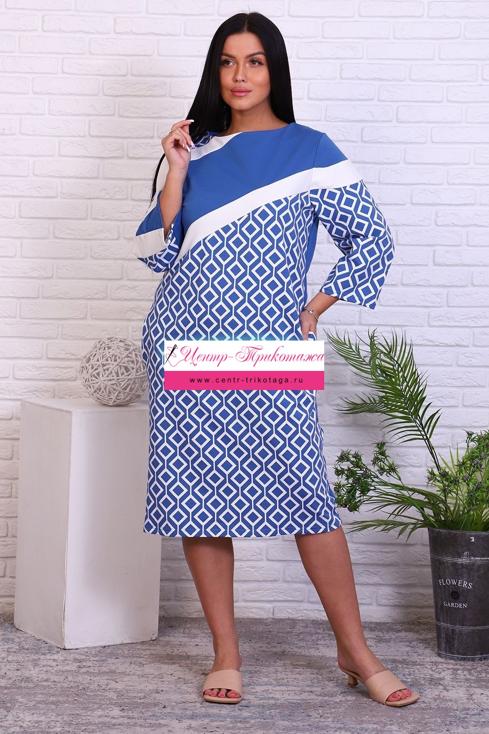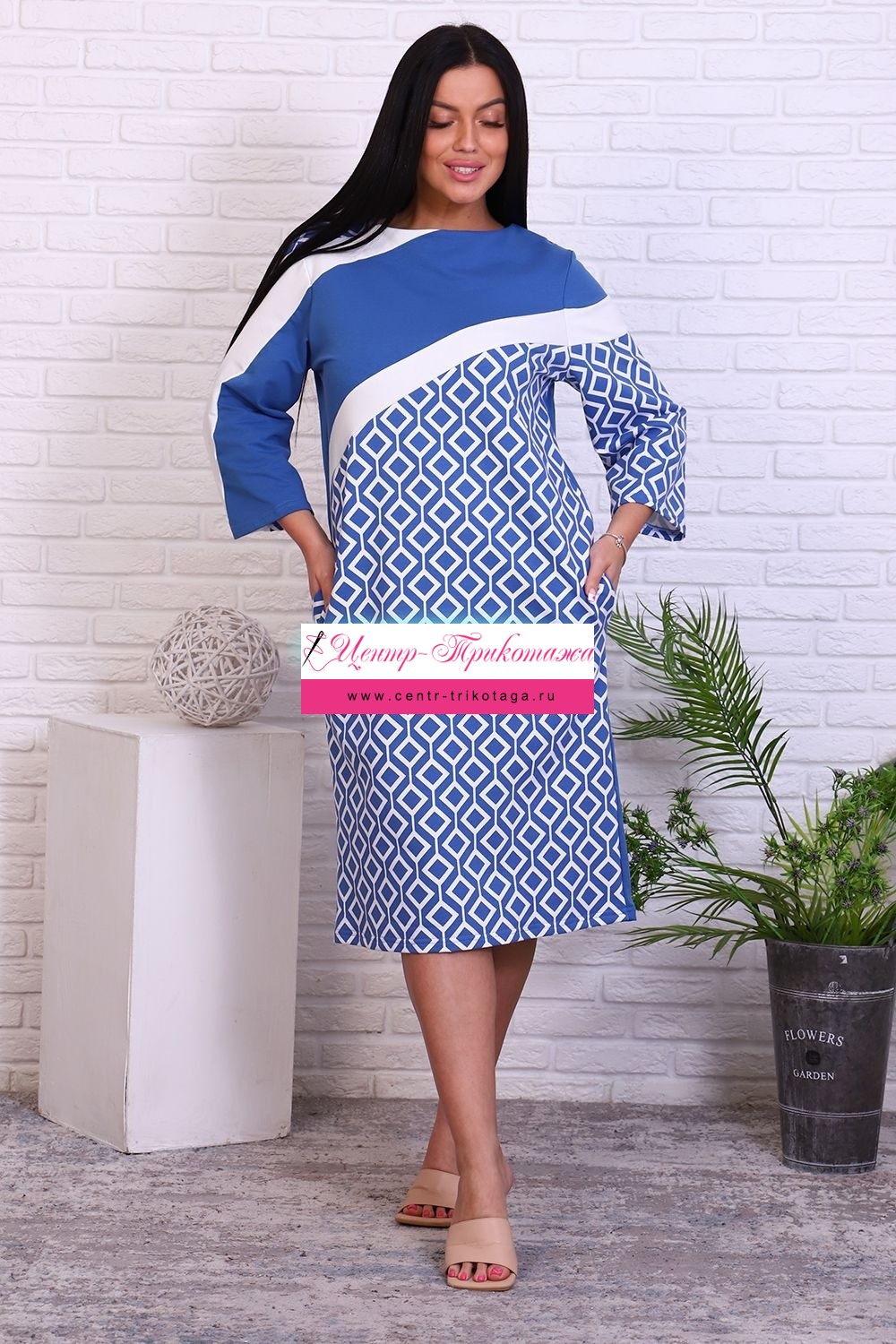 Элегантное женское платье оригинального кроя из комбинированного футера. Платье прямого силуэта с карманами в боковых швах. На полочке и рукавах декоративные вставки однотонного цвета. Рукав 3/4. Платье подойдет как для офиса, так и для выхода в ресторан.