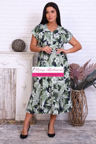 Платье женское удлиненное со спущенным рукавом, на полочке подрез, планка на трех декоративных пуговицах, внизу расклешение. Рисунок ткани красивый, насыщенный. Модель придает легкость, изящность, подойдет на каждый день, для прогулки и дома.