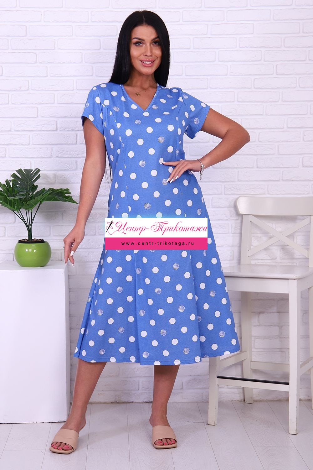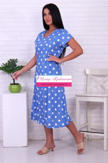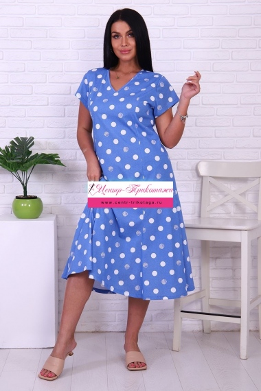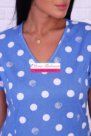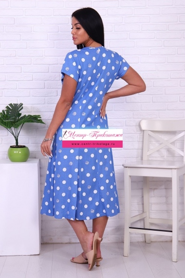Платье из ткани кулирка расцветка горох . Платье выполнено в легком стиле, с коротким рукавом, горловина V вырезом, в районе талии немного заужено, к низу умеренно расклёшено, что придает платью легкость и элегантность. Подойдет для прогулок, дома, и отдыха.