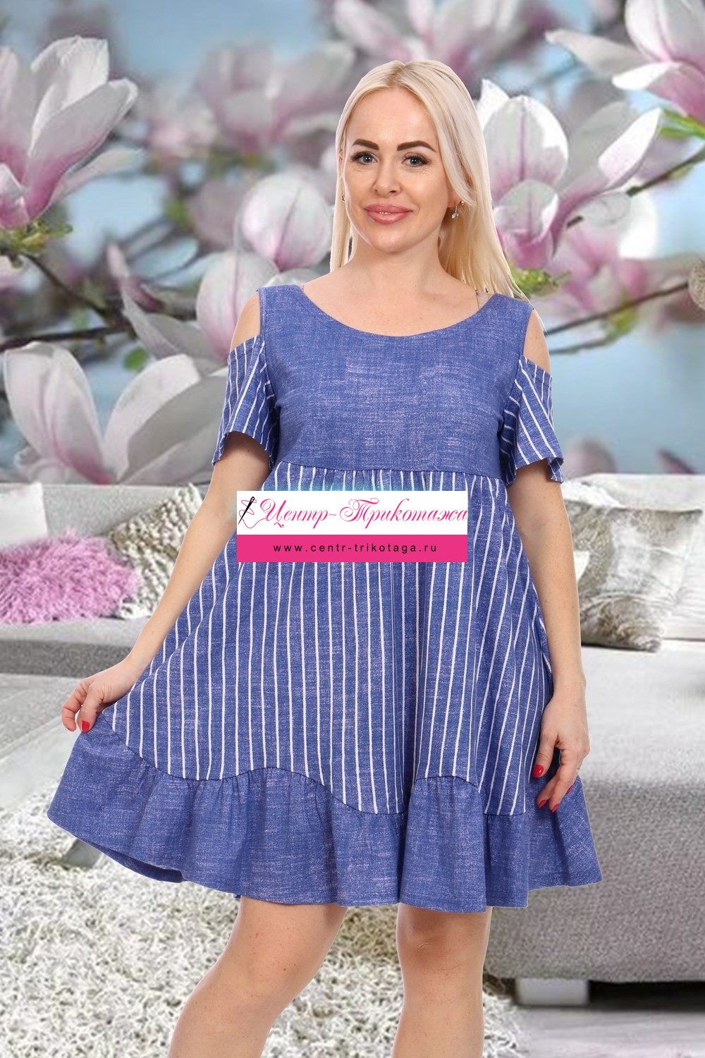 Платье женское молодежное, к низу расширенное, отрезное выше линии талии. Полочка, спинка и волан внизу из однотонной ткани, нижняя часть платья и рукав из ткани-компаньона в полоску.