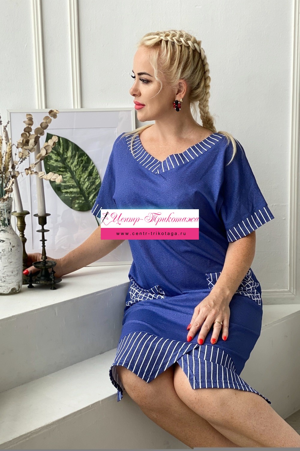 Платье прямого силуэта с цельнокроенным коротким рукавом на манжете. Вырез горловины спереди и сзади Y-образный. Обтачки горловины, накладных карманов, низ изделия и манжеты рукавов из отделочной ткани в полоску, накладные карманы на полочке в клетку