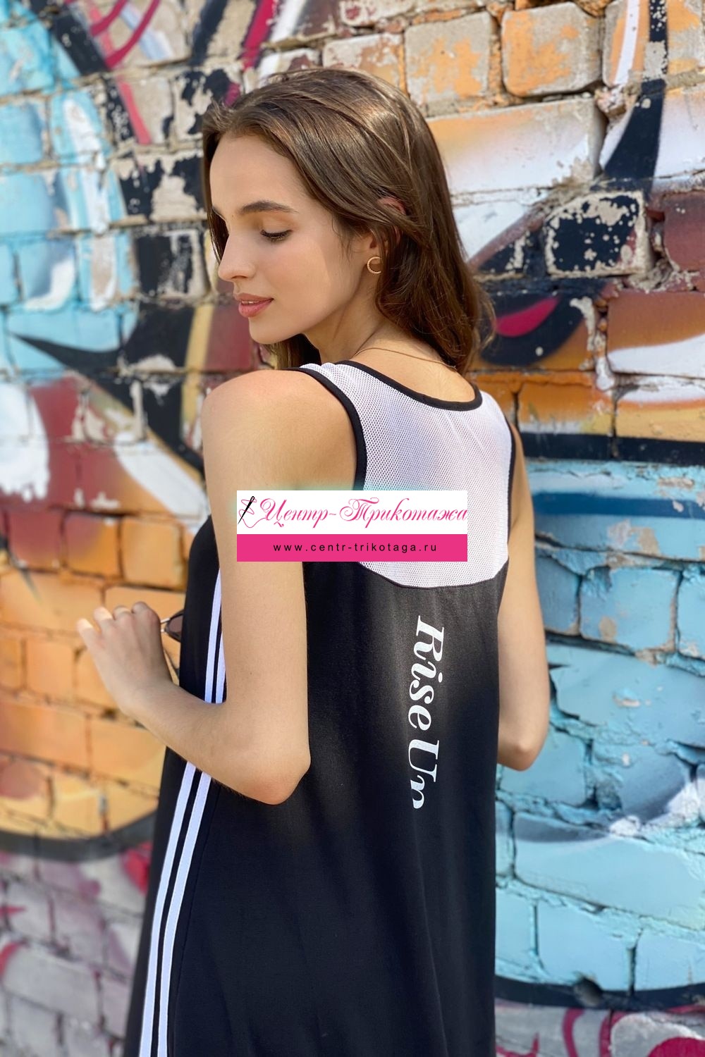 Сарафан в спортивном стиле, трапециевидного силуэта, с V-образной горловиной, с удлиненной асимметричной линией низа. В верхней части спинки расположена кокетка из сетки. Вдоль боковых швов расположены лампасы контрастного цвета. Горловина и проймы обработаны бейкой из основного полотна.