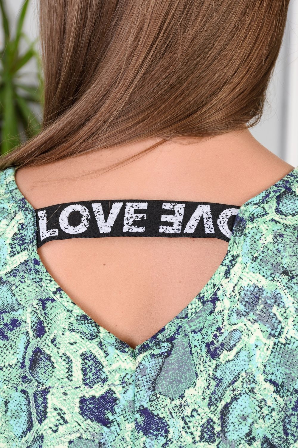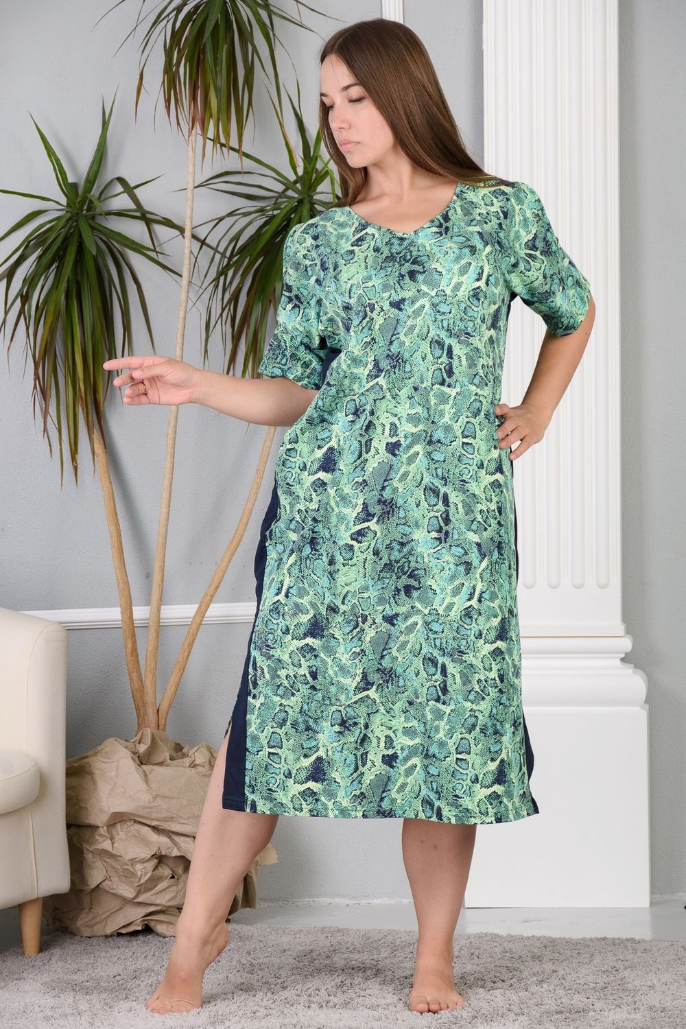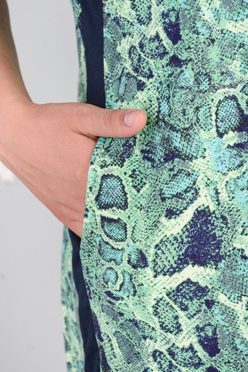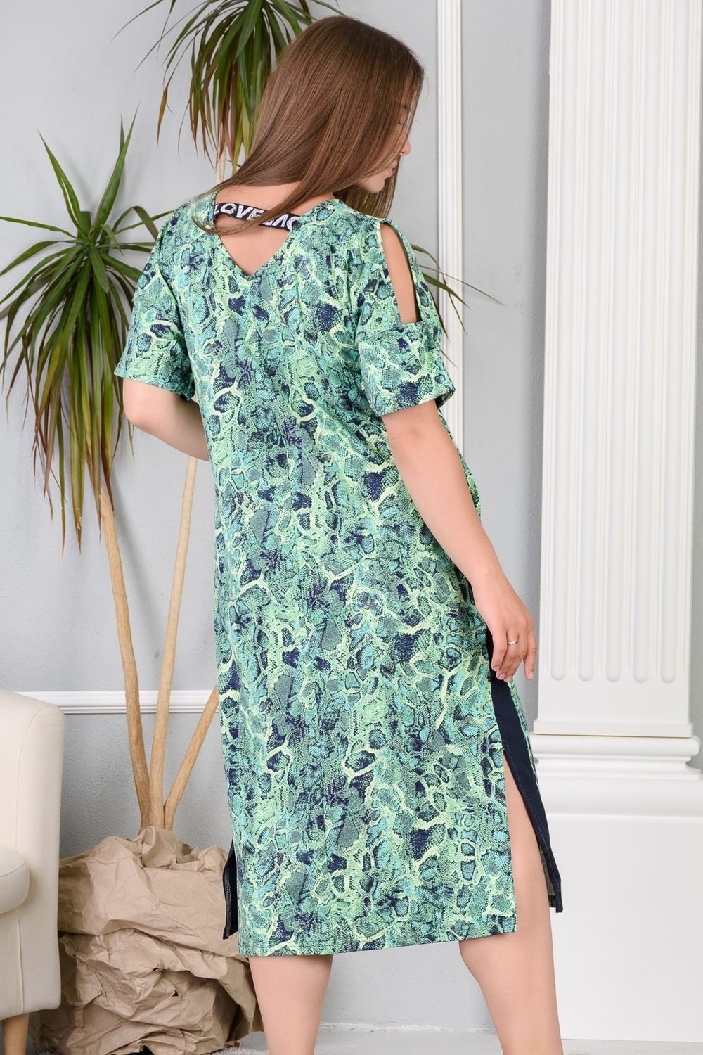 Платье прямое, длинное, с V-образной горловиной, с боковыми карманами. Рукав короткий. На плечах обработаны декоративные вырезы. Полочка с лампасами контрастного цвета вдоль боковых швов. В нижней части боковых швов обработаны разрезы. В верхней части спинки обработан фигурный вырез с резинкой. Горловина и вырезы на плечах обработаны бейкой из основного полотна.