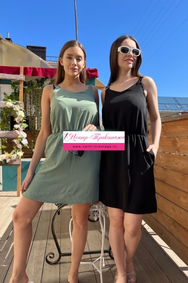 Сарафан прямой, длинной выше колена, с V-образной горловиной на полочке и спинке, с боковыми карманами, по линии талии собран на резинку. В нижней части боковых швов обработаны разрезы.