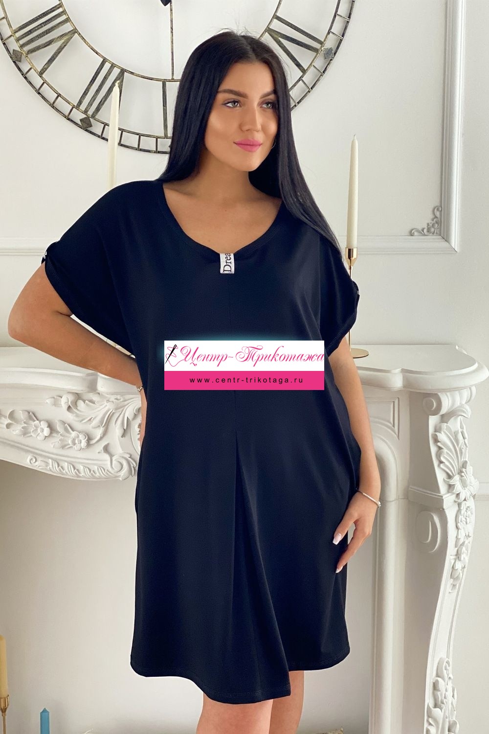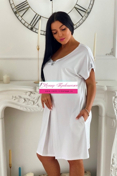 Платье женское прямого силуэта. Рукав цельнокроенный короткий. Середина горловины полочки и низ рукава слегка собран на декоративную серебряную тесьму. От линии талии по центру полочки встречная складка. В боковых швах изделия есть карманы.