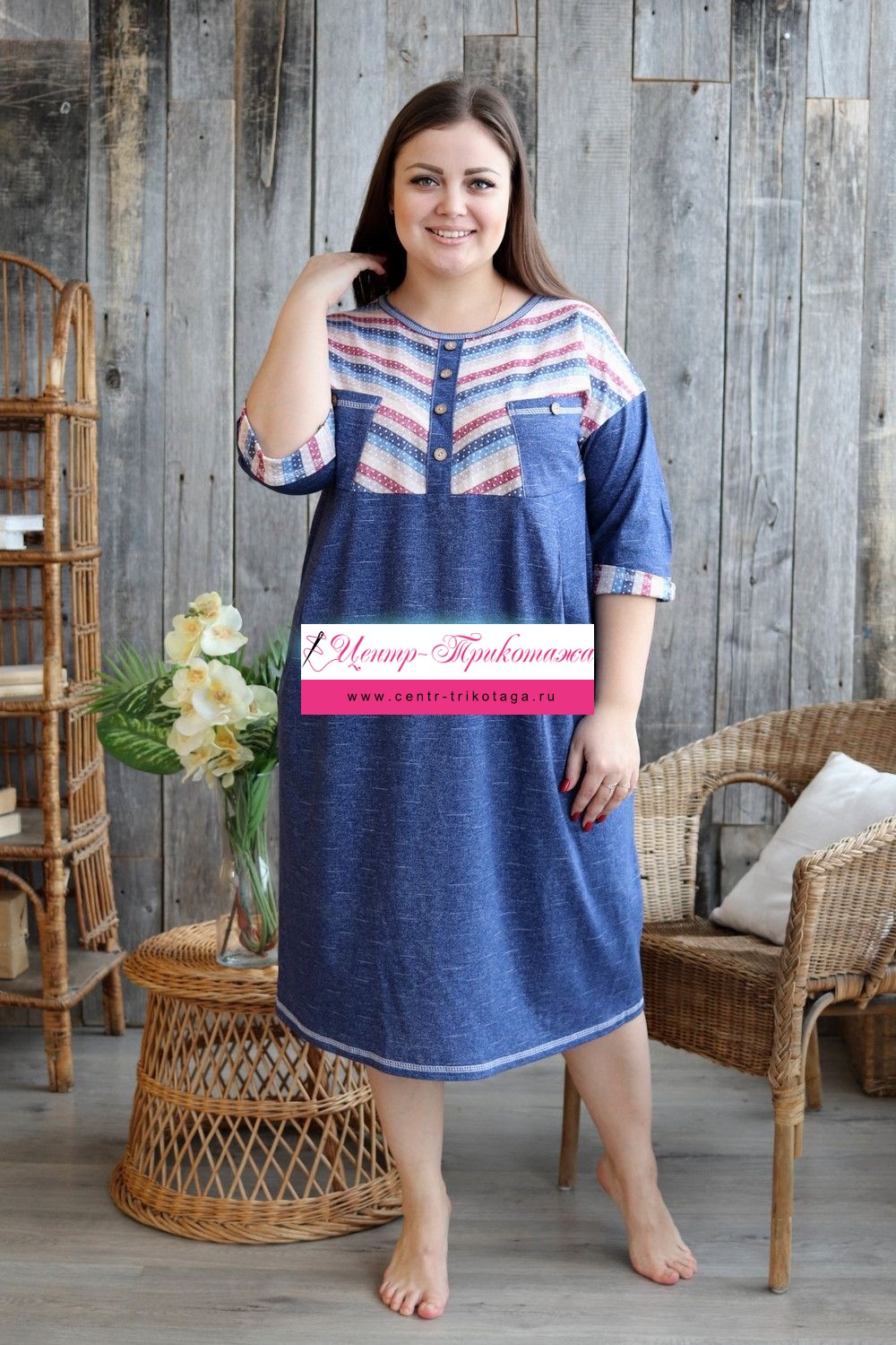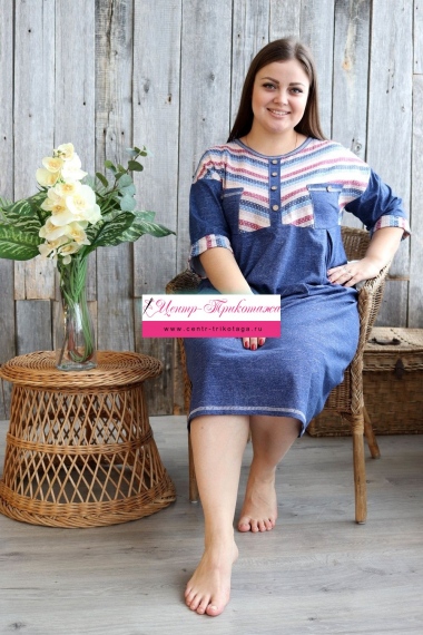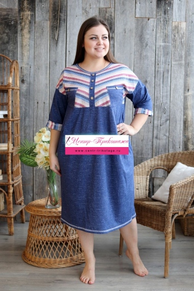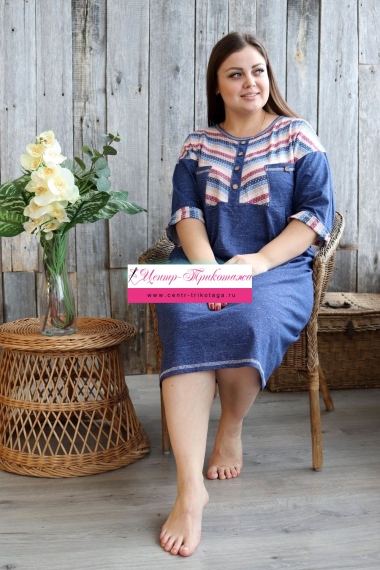 Платье женское прямого силуэта. Рукав цельнокроенный со швом. Верхняя часть полочки и манжета рукава из отделочной ткани в полоску. В верхней части полочки накладные карманы и имитация планки, в нижней: встречные складки, обеспечивающие дополнительную свободу в области талии и бедер. На модели 52 размер