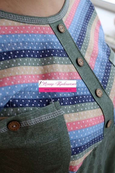 Платье женское прямого силуэта. Рукав цельнокроенный со швом. Верхняя часть полочки и манжета рукава из отделочной ткани в полоску. В верхней части полочки накладные карманы и имитация планки, в нижней: встречные складки, обеспечивающие дополнительную свободу в области талии и бедер. На модели 52 размер