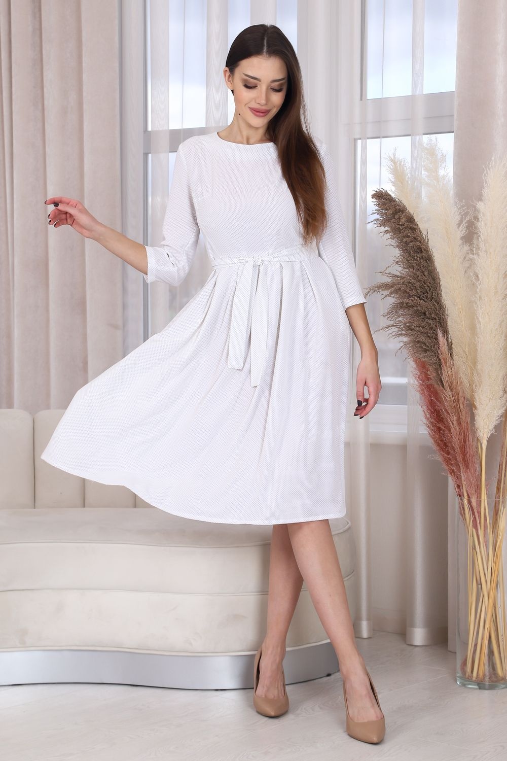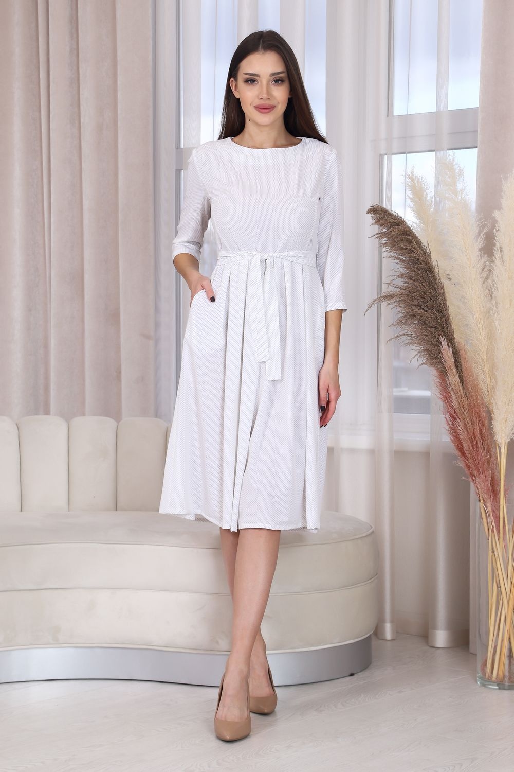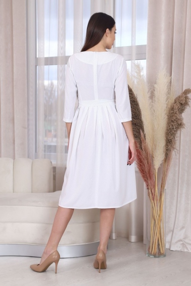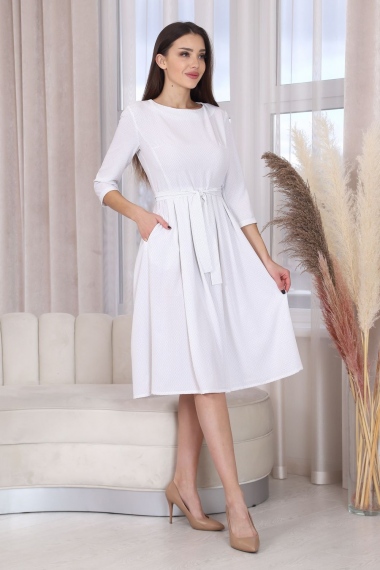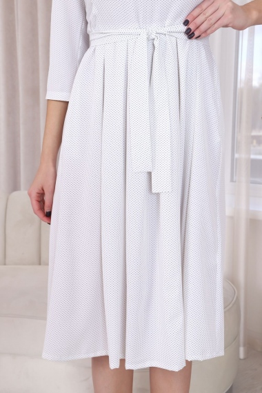 Платье с застежкой на потайную молнию в среднем шве спинки, без воротника, в круглым вырезом горловины. Платье отрезное по линии талии. Нижняя часть платья оформлена складками по шву притачивания к лифу. В боковых швах расположены карманы. Универсальность в сочетании с невесомостью и текстурой материала делают эту модель востребованной в любых случаях.