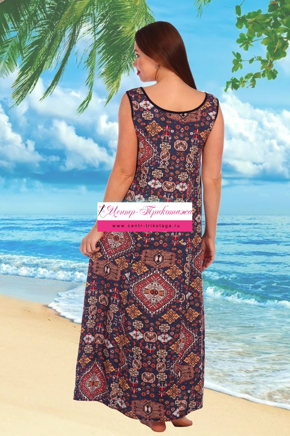 Сарафан женский полуприлегающего силуэта, слегка расклешенный к низу, длинный, в боковых швах разрезы. Линия подреза несколько выше линии талии. На нижней части полочки и спинки рельефы. В верхней части полочки по горловине небольшая сборка, фиксирующаяся завязками. Сарафан выполнен из легкого штапеля с красивым орнаментом.