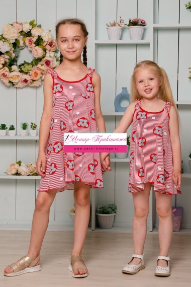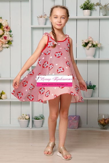Сарафан детский летний, свободного силуэта с завышенной линией талии. Бретели выполнены из основной ткани собранной на тонкую резинку. Низ изделия обработан декоративной краеобметочной строчкой.