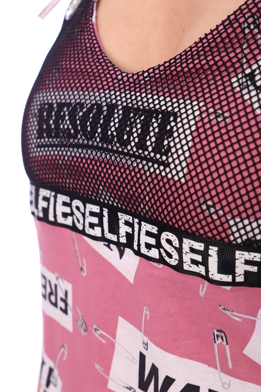 Молодежный сарафан на завязках. Фигурный вырез горловины с люверсами спереди и сзади, по верху кокетки - сетка. Посадка и длина регулируются шнурками
