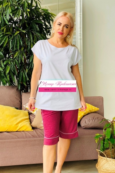 Шорты бермуды широкие, прямые, длиной ниже колена, на эластичном поясе, с карманами, со вставкой вдоль боковых швов. Низ шорт обработан манжетом. Спереди по шву притачивания пояса заложены складки. Вход в карман шорт обработан бейкой из основного полотна.