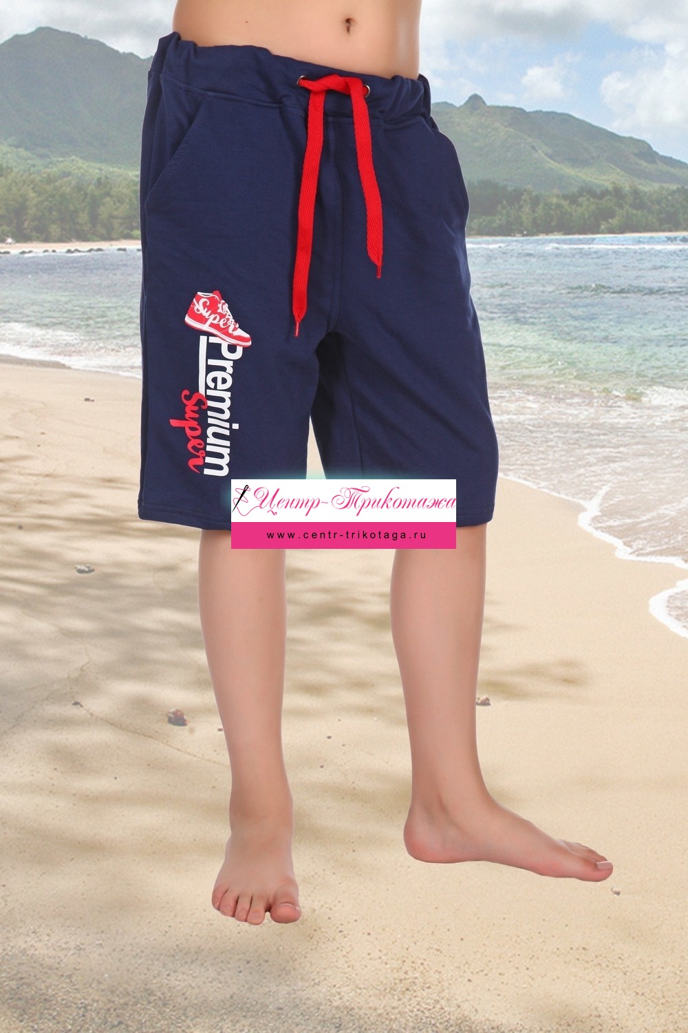 Шорты из футера с лайкрой для мальчиков. Принт в виде кроссовка и надписей, пояс со шнурком на резинке, боковые карманы, длина приблизительно до коленей. Две расцветки — серая и синяя. Размеры от 30 до 40. Возможен заказ товара в розницу.