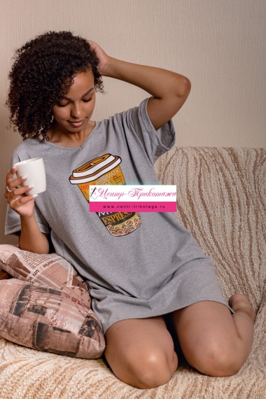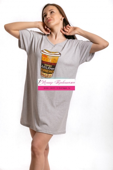 Молодёжная сорочка в виде удлинённой свободной футболки с современным принтом. Благодаря наличию в составе небольшого количества полиэстера сорочка не мнётся. Можно использовать в качестве домашней туники. Оттенок серого меланжа может отличаться