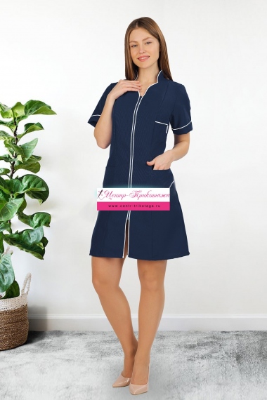Халат длинной чуть выше колена, приталенного силуэта. Полочка с рельефами, с боковыми карманами. На спинке также рельефные швы, средний шов со шлицей, пояс-хляст. Рукав длиной ¾. Вырез горловины V-образный, с воротником-стойкой.