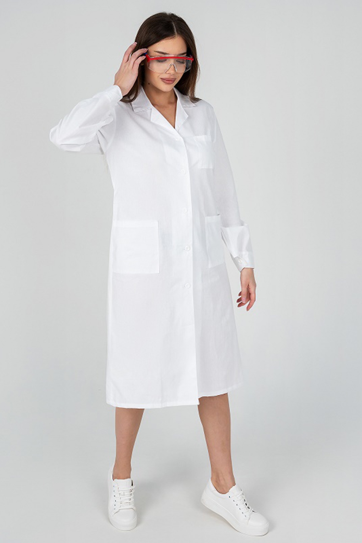Халат рабочий оснащен тремя накладными карманами: одним нагрудным и двумя боковыми. Халат застегивается на 5 пуговиц и 5 обметанных петель. Имеет отложной воротник и втачные рукава с манжетами, застегивающимися на пуговицы. Спинка с хлястиками-завязками. По карманам, воротнику и манжетам халата проложены отделочные строчки.