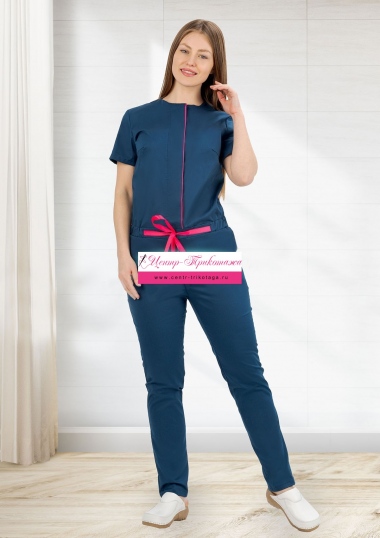 Комбинезон медицинский женский Фламинго полу-прилегающего силуэта, с центральной бортовой супатной застежкой на лифе на шесть кнопок, отрезной ниже линии талии. Полочки лифа с нагрудными выточками, с горловиной закругленной формы, обработанной притачными обтачками. По краю борта правой полочки проходит кант из-под борта. Спинка цельнокроеная. Горловина спинки обработана притачной обтачкой. Рукава втачные, одношовные, короткие. Передние половинки брюк с боковыми карманами, с наклонным входом в отрезных бочках. Задние половинки брюк цельнокроеные. Лиф с брюками соединяются поясом.