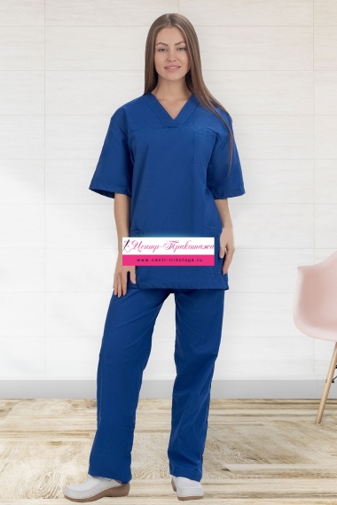 Костюм состоит из куртки и брюк. Куртка прямого силуэта длиной до бедер. Полочка с кокетками, с V-образным вырезом горловины, с планками по горловине, с двумя боковыми и нагрудным карманами. Рукава короткие. Брюки прямые на резинке.