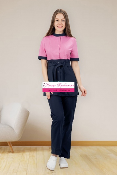 Костюм медицинский "Алиса" состоит из куртки и брюк. Куртка прилегающего силуэта, скомбинированная из тканей контрастных оттенков. На полочке центральная бортовая застежка на кнопки и два боковых кармана. Воротник-стойка, рукав втачной, короткий. Прилегание куртки дополнительно регулируется поясом. Брюки прямые на резинке. Костюм предназначен для медицинских работников.