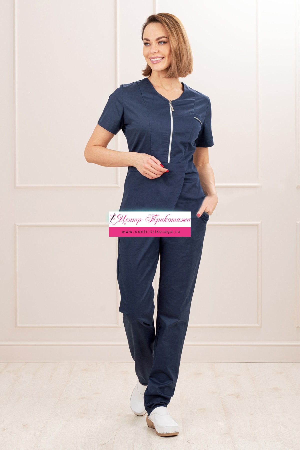 Костюм медицинский женский "Линда", прилегающего силуэта, состоит из куртки и брюк. Куртка имеет застежку – молнию, накладной карман и ассиметричный крой передних полочек. Брюки выполнены в классическом стиле. Использована качественная фурнитура. Костюм идеально садится по фигуре и подчеркивает ее достоинства. Костюм предназначен для медицинских работников и сотрудников СПА салонов.