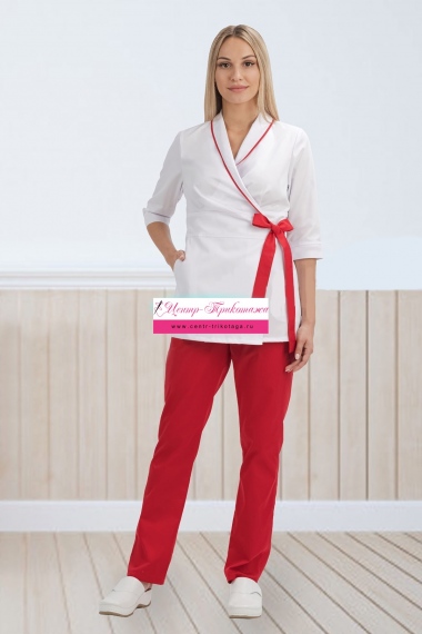 Костюм медицинский Офелия. Блуза прилегающего силуэта с запахом. Спереди втачной пояс и два внутренних боковых кармана. В горловине шалевый воротник. Рукав втачной, длиной 3/4. Пояса-завязки и кант по воротнику выполнены в цвет брюк. Пояс завязывается в виде красивого красного банта, который придает костюму элегантный образ. Брюки прямые на резинке. Костюм предназначен для медицинских работников.