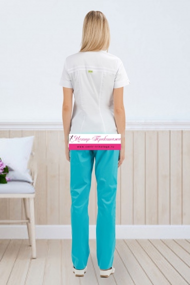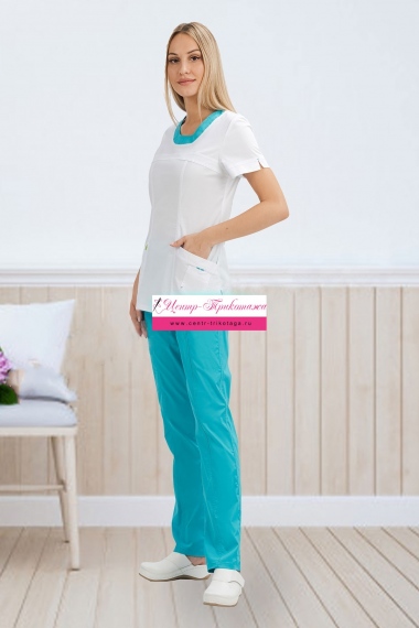 Костюм медицинский Оливия выполнен в двух цветовых вариациях. Куртка прилегающего силуэта за счет множества рельефных линий на полочке и спинке. Спереди глубокая круглая горловина, обработанная яркой планкой, два нижних больших и два маленьких кармана. Также куртка дополнена яркими декоративными элементами в цвет брюк. Брюки прямые с резинкой по талии. В передней части брюк выполнен рельефный шов. Справа, на уровне середины бедра, небольшой кармашек с клапаном. Костюм предназначен для медицинских работников.