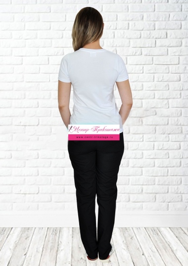 Футболка выполнена из трикотажного полотна с содержанием лайкры, что делает ее очень комфортной. Футболка имеет стандартный силуэт с круглым вырезом горловины и укороченным рукавом и декорирована принтом с медицинской тематикой.Брюки прямые на резинке из ткани тиси, выполнены с двумя боковыми потайными карманами, что делает их удобными при использовании аксессуаров.