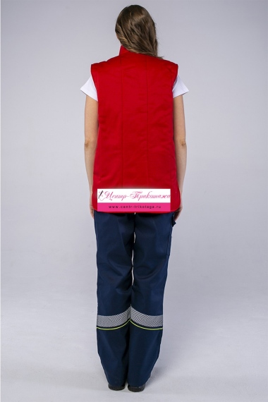 Жилет утепленный прямого силуэта с центральной застёжкой на тесьму «молния», полочки с боковыми накладными карманами с застёжкой на одну кнопку. Спинка удлинённая с разрезами в области боковых швов, углы разрезов скругленные, воротник «стойка». В качестве утеплителя жилета используется синтепон. Жилет является универсальным для использования как мужчинам, так и женщинам.