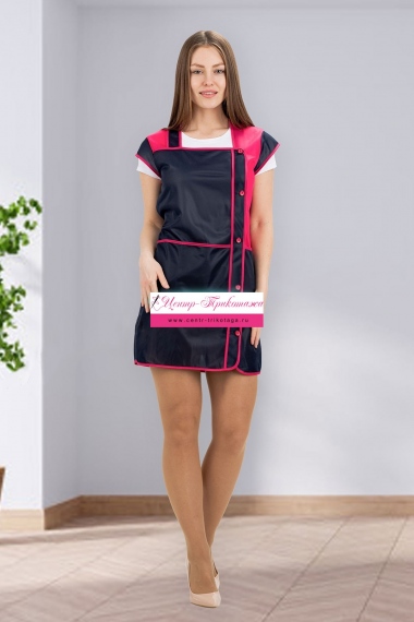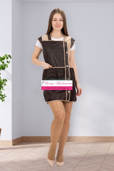 Сарафан женский укороченный прямого силуэта. Полочка со смещенной на левую сторону застежкой на петли и пуговицы, с отделочными элементами из контрастной ткани и нижним вместительным карманом из трех частей. Спинка без отделки с двумя завязывающими полупоясами для регулировки объема талии, рукав-крыло. Все детали изделия обработаны кантом из нейлоновой ткани. Сарафан предназначен для защиты от общепроизводственных загрязнений.