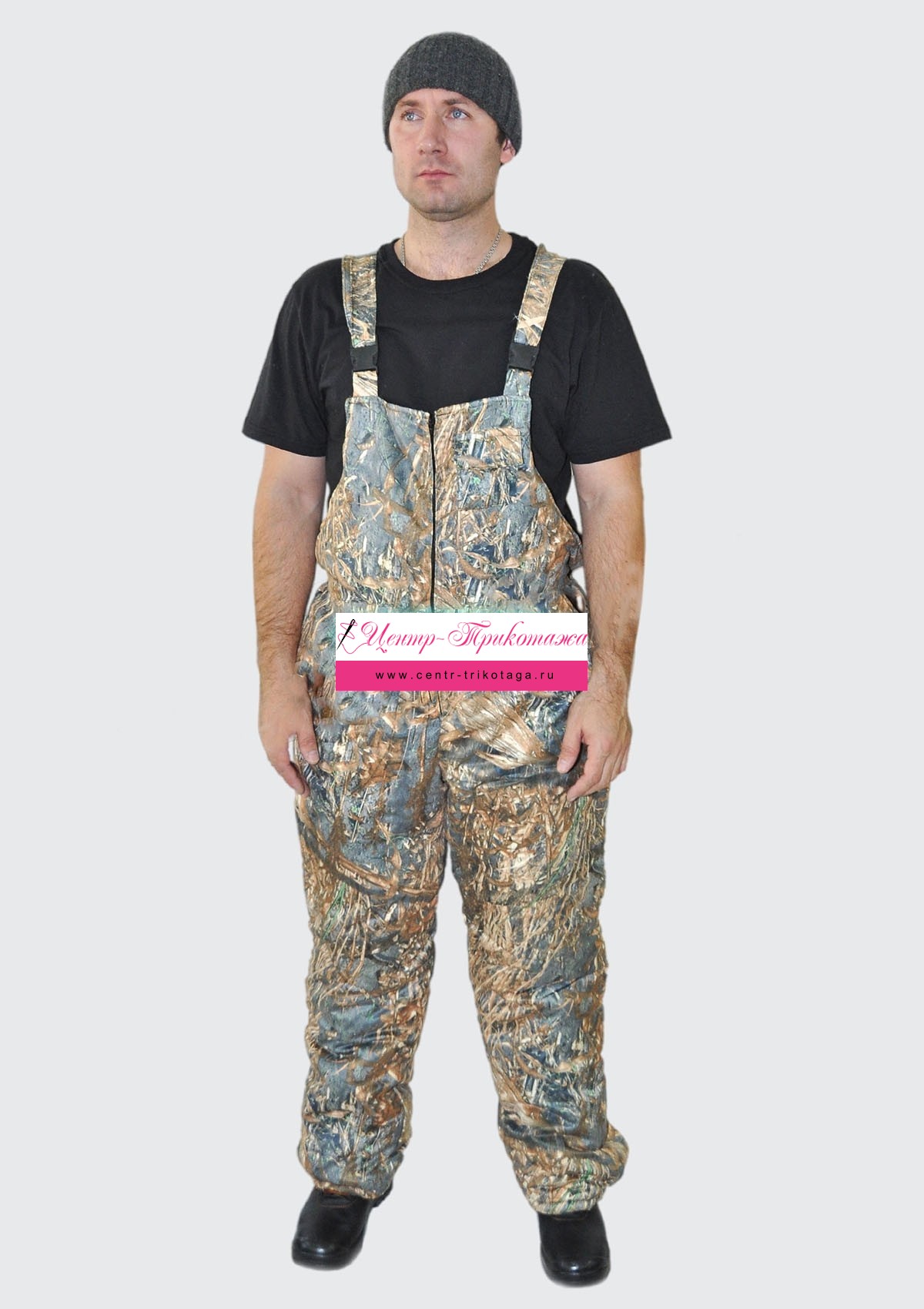 Костюм состоит из куртки и полукомбинезона. Куртка мужская, с центральной бортовой застежкой на молнии. Молния закрыта притачным клапаном. Воротник-стойка. Капюшон съемный, по лицевому вырезу стягивается шнуром. На полочке четыре объемных накладных кармана, один внутренний карман. В нижних карманах предусмотрен съемный патронташ. Рукав на манжете, стянутой эластичной лентой. На рукавах накладные объемные карманы с застежкой на молнии. Низ куртки стягивается шнуром. Полукомбинезон с центральной застежкой на молнии. Спинка по талии стянута эластичной лентой. Длина бретелей регулируется цупферными замками. На полукомбинезоне три кармана: один верхний накладной карман с клапаном на левой половинке, два нижних кармана в отрезных бочках. В нижней части боковых швов – пуфты. Пуфты закрыты клапанами.