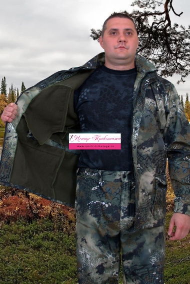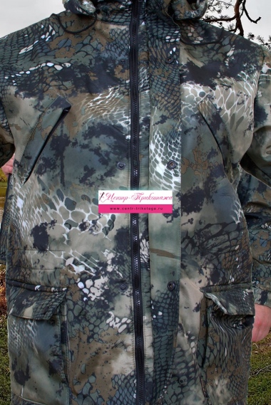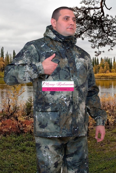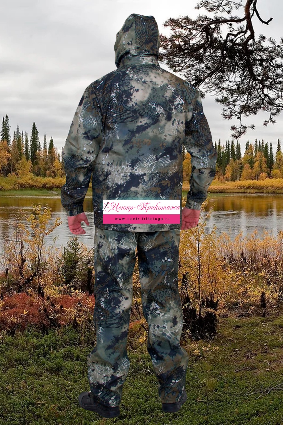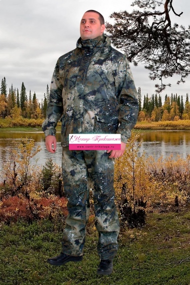 Ветровлагозащитный костюм для охоты и рыбалки состоит из куртки и брюк. Куртка удлиненная с центральной застежкой на молнию с ветрозащитным клапаном, верхними врезными под молнию и нижними накладными полуобъемными карманами с клапанами. Брюки с анатомическими наколенниками имеют два врезных боковых кармана. Пояс на эластичной тесьме. Низ брюк регулируется по ширине шнуром с фиксатором.