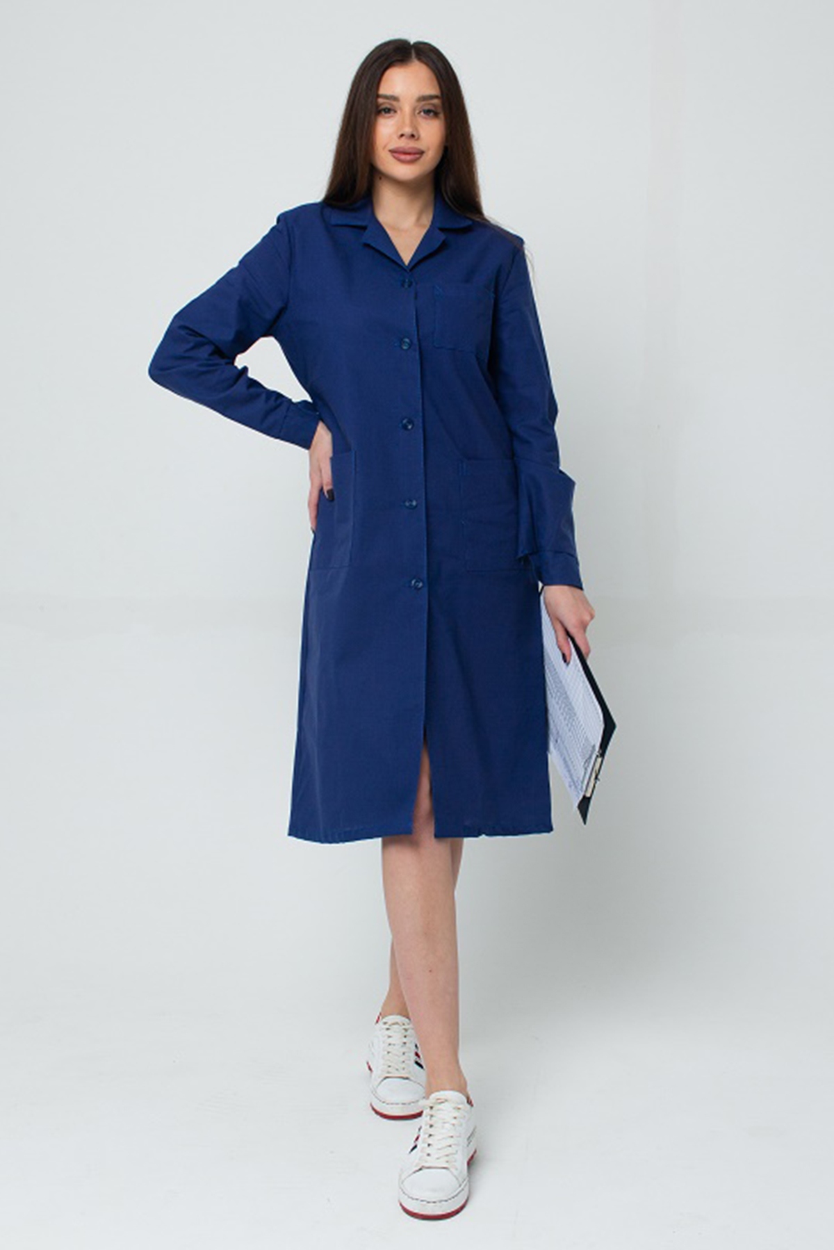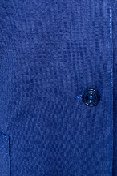 Халат рабочий оснащен тремя накладными карманами: одним нагрудным и двумя боковыми. Халат застегивается на 5 пуговиц и