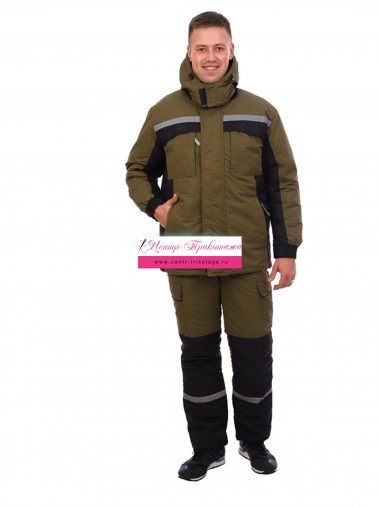 Костюм 2 класса защиты с притачном утеплителем, состоит из куртки и полукомбинезона. Куртка с центральной застежкой на молнию, закрытую ветрозащитным клапаном, клапан фиксируется на контактную ленту, два нагрудных накладных кармана, застегивающиеся на молнию, два нижних кармана обработаны в рельефних швах, два накладных кармана на подкладке, застегивающиеся на молнию, спинка со складками, рукава на манжете, стянутой частично эластичной тесьмой, воротник - стойка, капюшон съемный с регулировкой по объему, кулиса по низу для регулировки ширины. Полукомбинезон с центральной застежкой на двухзамковую молнию, бретели с эластичной тесьмой, регулируются по длине, карманы боковые внутренние, нагрудный карман прорезной на молнии, накладные карманы с клапанами, в области боковых швов вставлен клин из эластичного