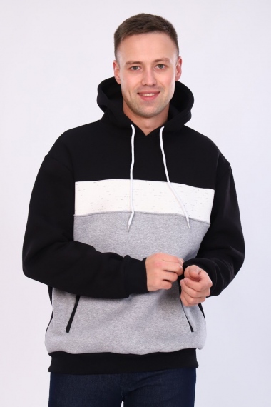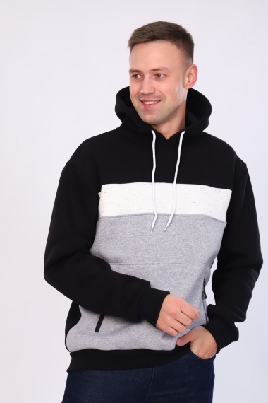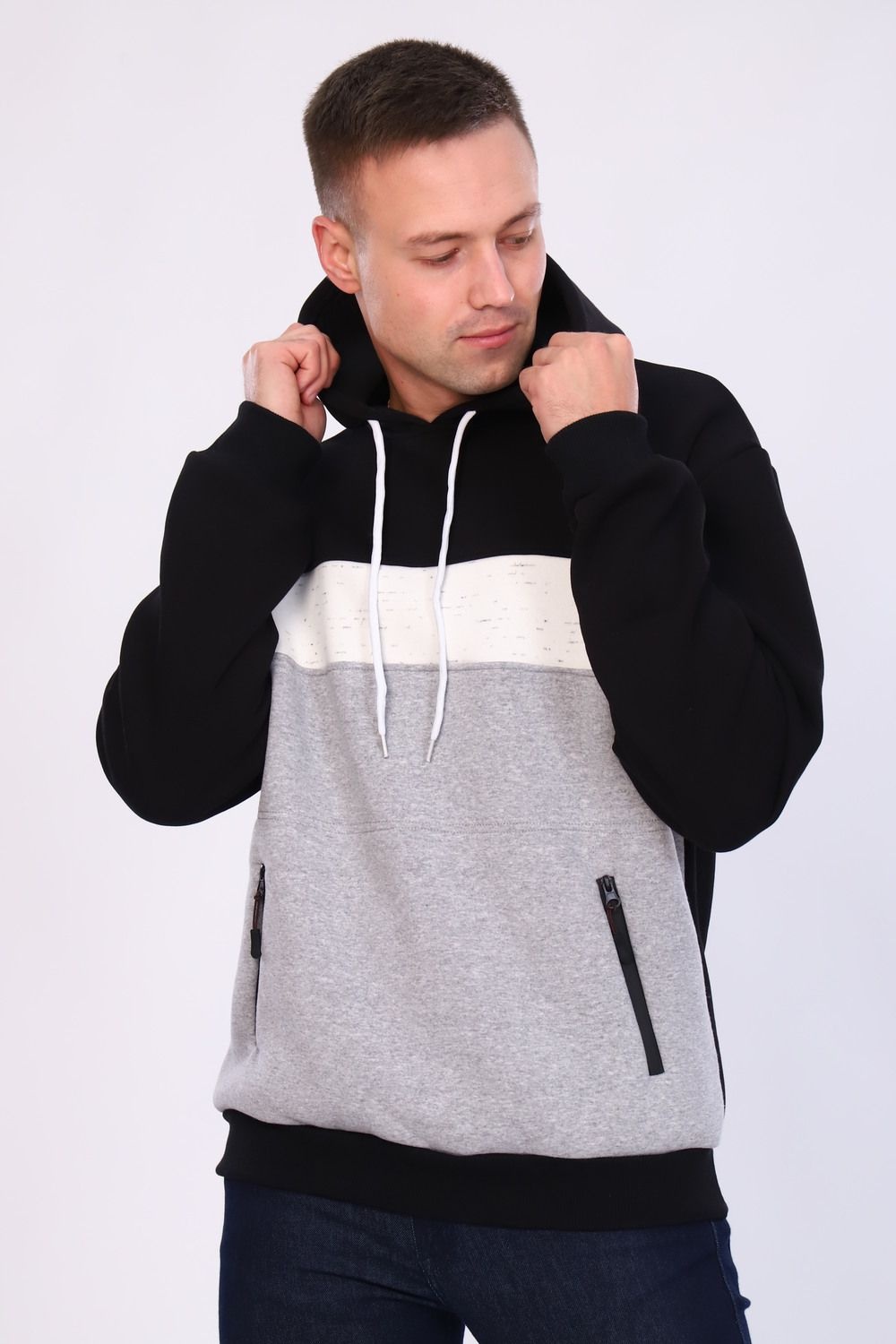 Стильная мужская толстовка с капюшоном выполнена из футера трёх нитки пенье компакт. Она имеет начес, что делает её идеальным выбором для прохладных дней. Капюшон регулируется шнурком. По бокам расположены вместительные карманы на молнии (кенгуру). Доступна в нескольких базовых расцветках с контрастными вставками по типу колор-блок. Первая стирка с изнаночной стороны при 30 градусах. При первой стирке ворс начеса полиняет. Это нормально.