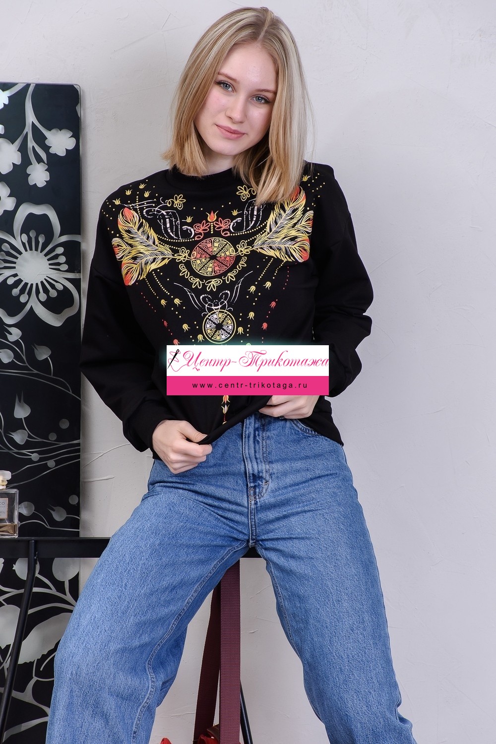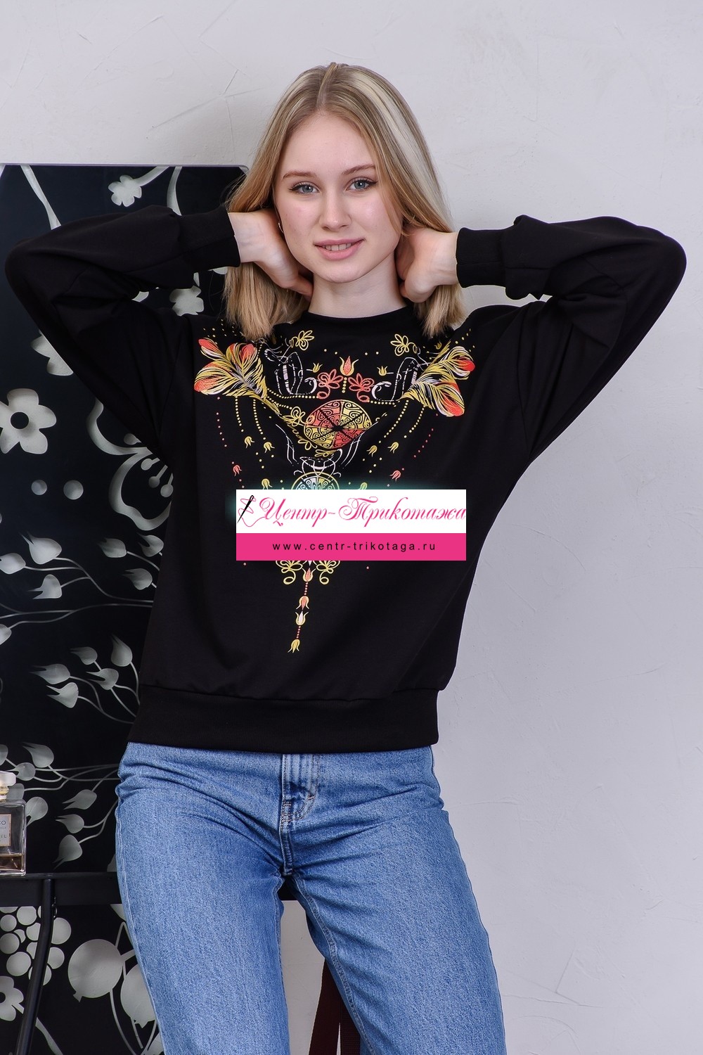 Толстовка свободного кроя с оригинальным принтом в виде орнамента, украшением которого является золотой глиттер. Эта модель хорошо сочетается как с джинсами, так и с брюками и юбками. Горловина, манжеты рукавов и низа изделия изготовлены из плотной, качественной резинки кашкорсе, которая при эксплуатации не растягивается. В характеристиках длина рукава указана от точки основания шеи вместе с манжетой.