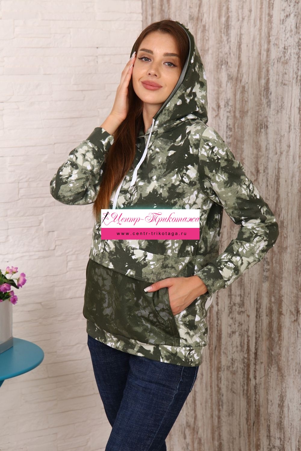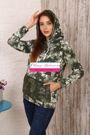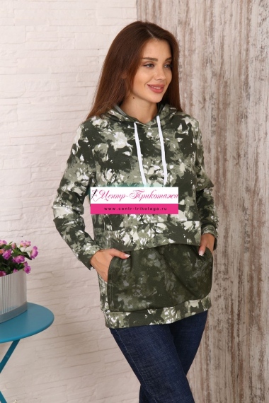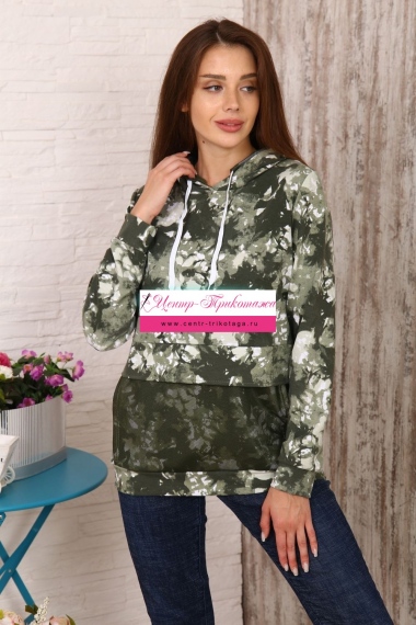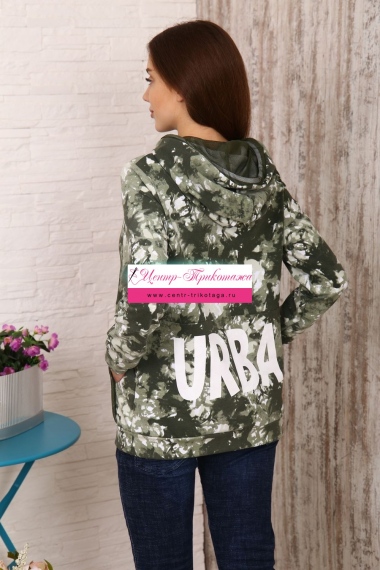 Модная толстовка выполнена из футера с дизайном тай - дай. На капюшоне и кармане присутствует отделка из сетки. На спинке толстовки белая модная надпись, которая сопровождает современную одежду и помогает нам создать индиввидуальность и образ в целом. Данную модель можно приобрести с брюками - костюмом 36516.