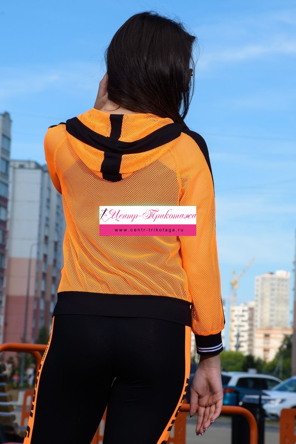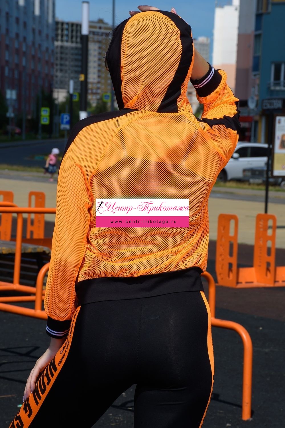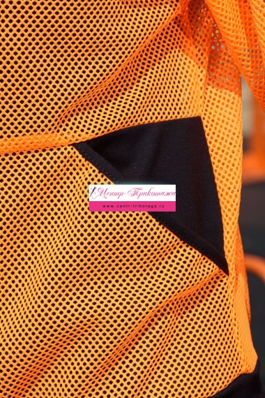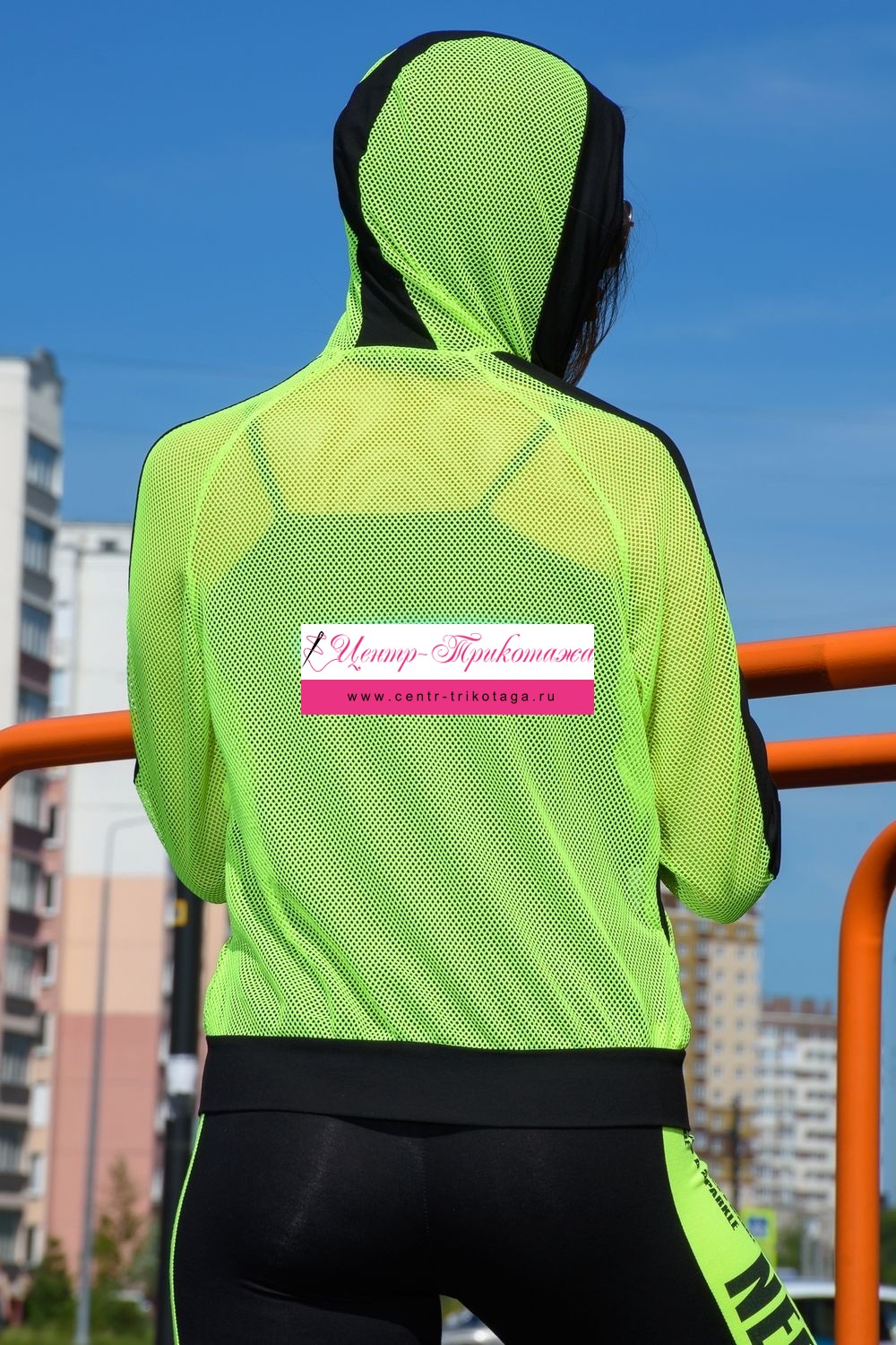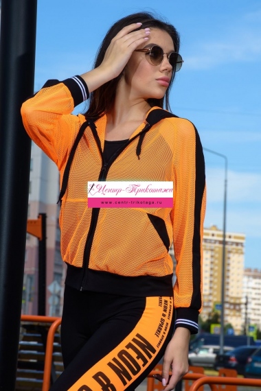 Толстовка с капюшоном из сетки, длиной до середины бедра. Рукав реглан длинный, из сетки, с контрастным лампасом вдоль рукава, на эластичном манжете. На полочке расположены фигурные карманы из сетки.