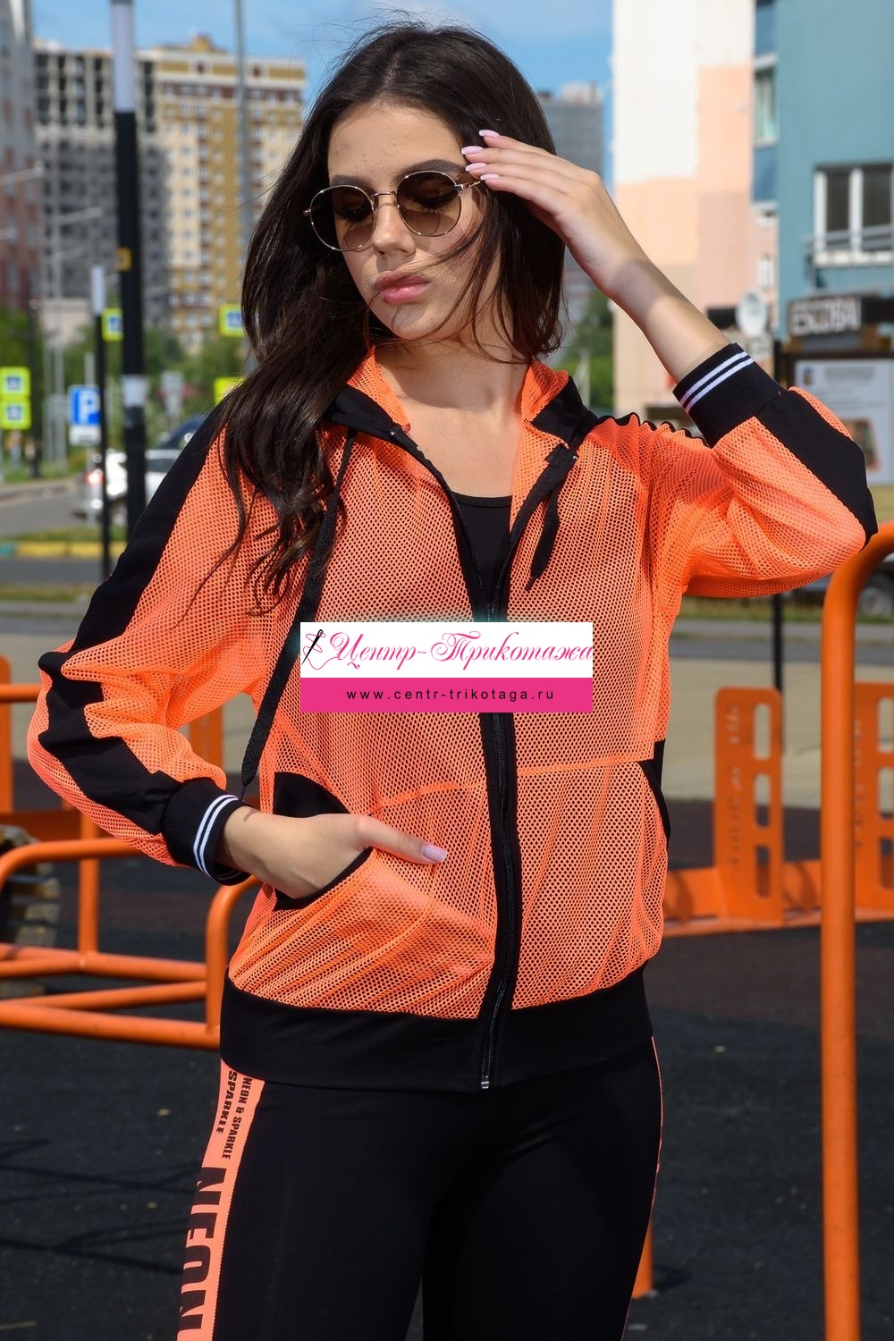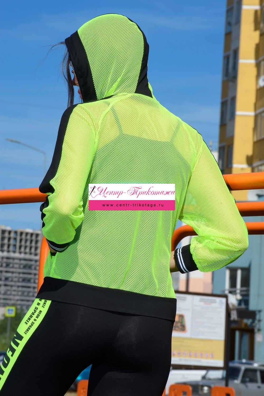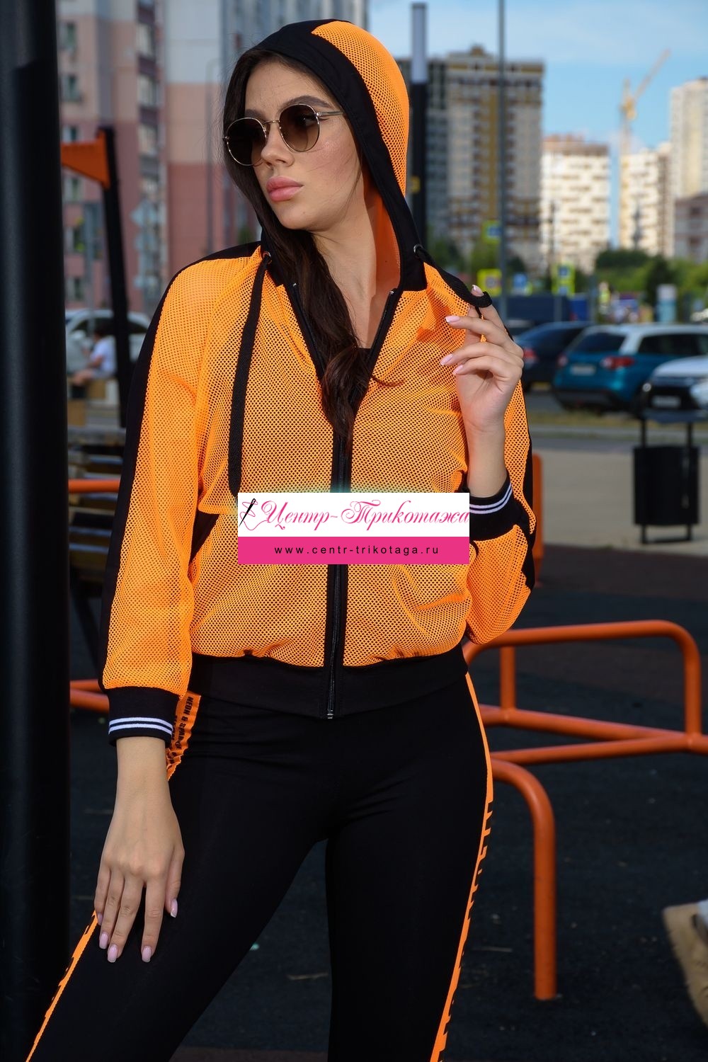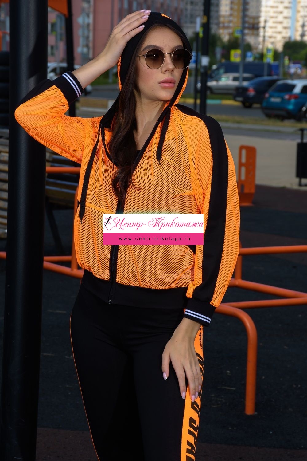 Толстовка с капюшоном из сетки, длиной до середины бедра. Рукав реглан длинный, из сетки, с контрастным лампасом вдоль рукава, на эластичном манжете. На полочке расположены фигурные карманы из сетки.
