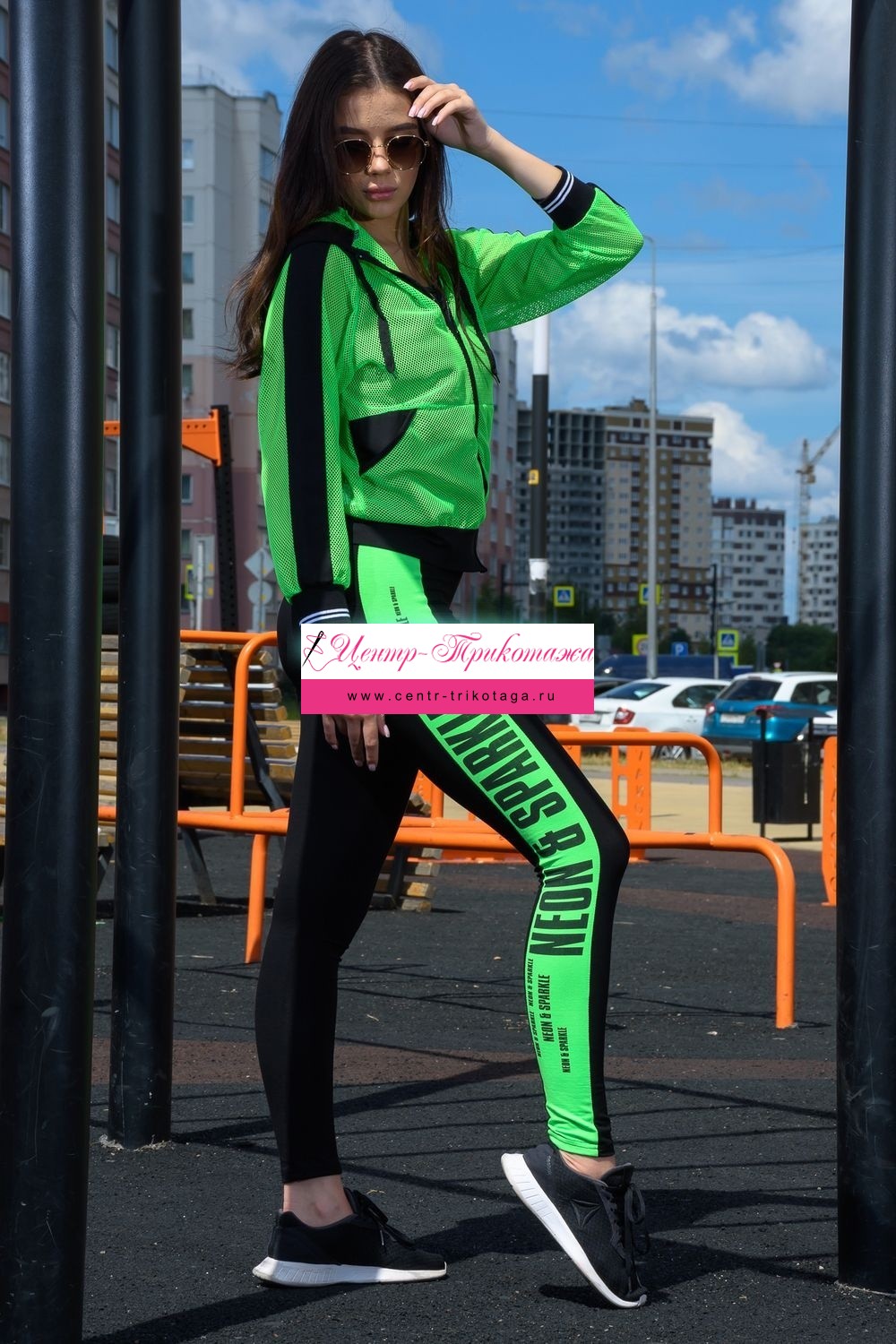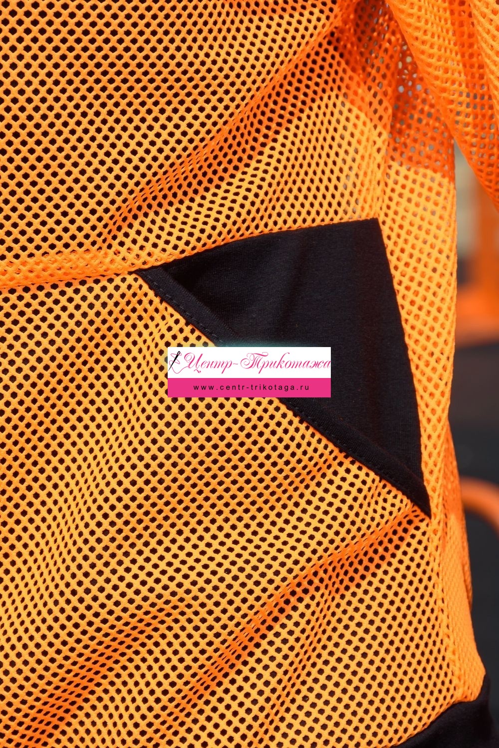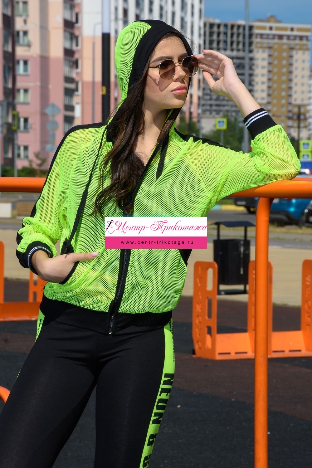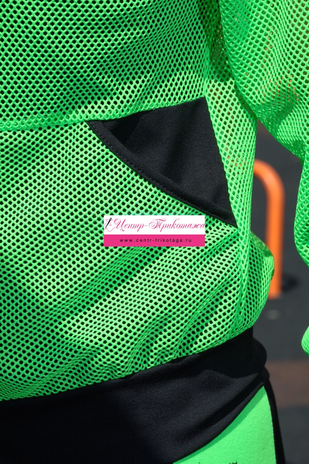 Толстовка с капюшоном из сетки, длиной до середины бедра. Рукав реглан длинный, из сетки, с контрастным лампасом вдоль рукава, на эластичном манжете. На полочке расположены фигурные карманы из сетки.
