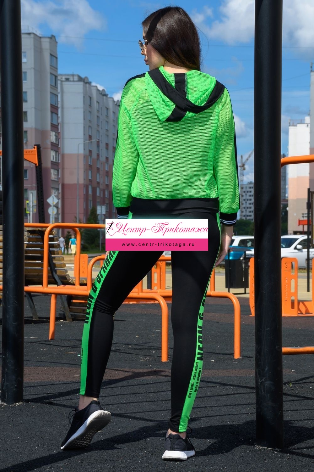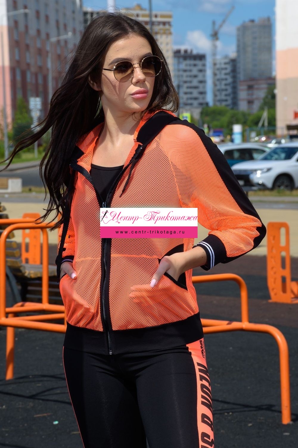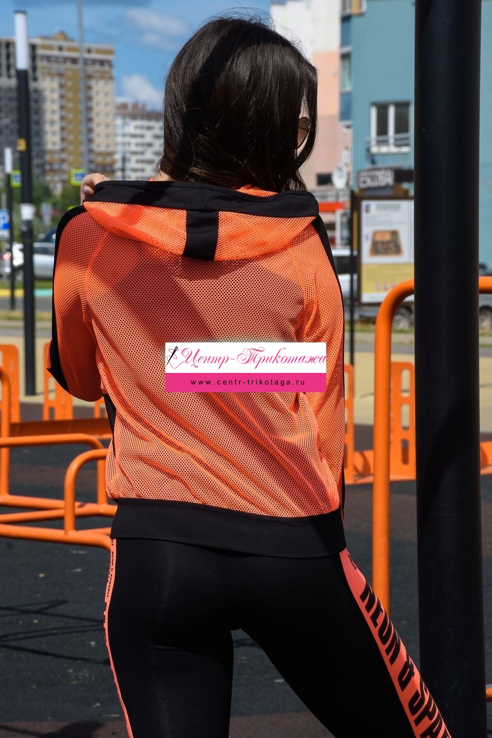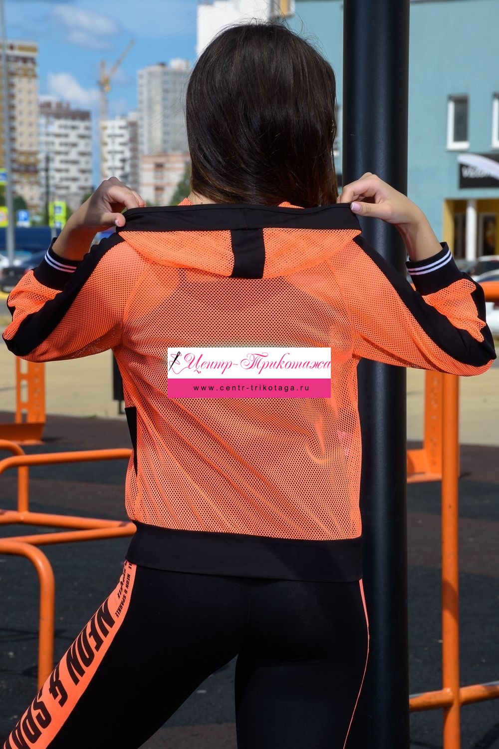 Толстовка с капюшоном из сетки, длиной до середины бедра. Рукав реглан длинный, из сетки, с контрастным лампасом вдоль рукава, на эластичном манжете. На полочке расположены фигурные карманы из сетки.