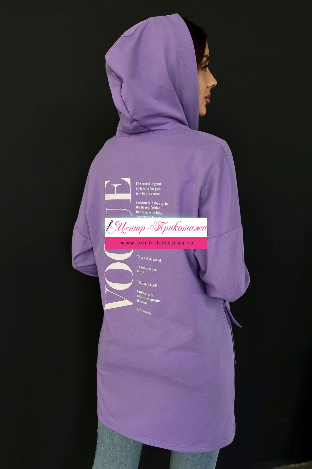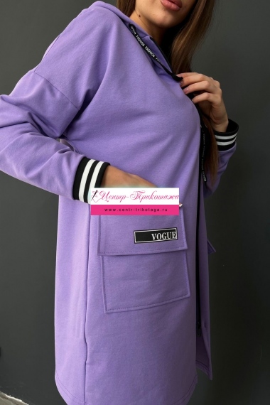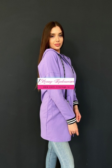 Толстовка прямая, свободная, удлиненная, с капюшоном, на молнии. Рукав длинный, на эластичном манжете. На полочке обработаны накладные карманы с клапаном.