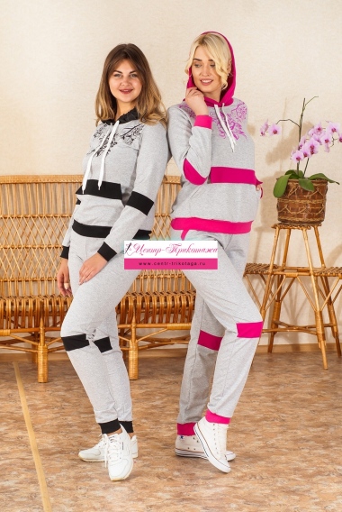 Костюм женский, брюки с карманами на манжете, толстовка с карманом (кенгуру) и капюшоном.