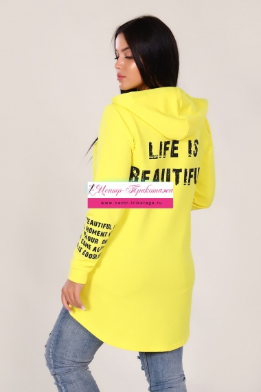 Толстовка удлиненная с принт-текстом на спине "Life is" (желтый) №417-4
