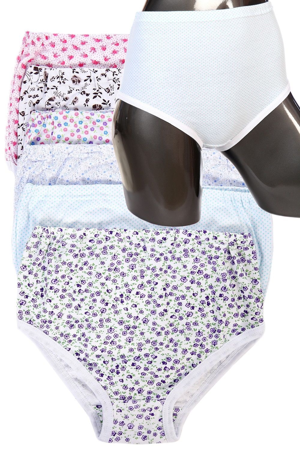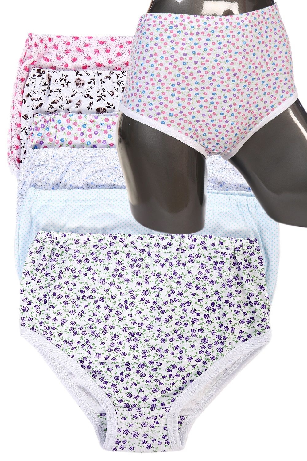 Трусы женские из кулирки. Три штуки в упаковке. Цветочный узор, белая окантовка, на резинке, несколько вариантов расцветки. Размеры от 48 до 62. Внимание, данный товар не подбирается по цветам и не продается в розницу!