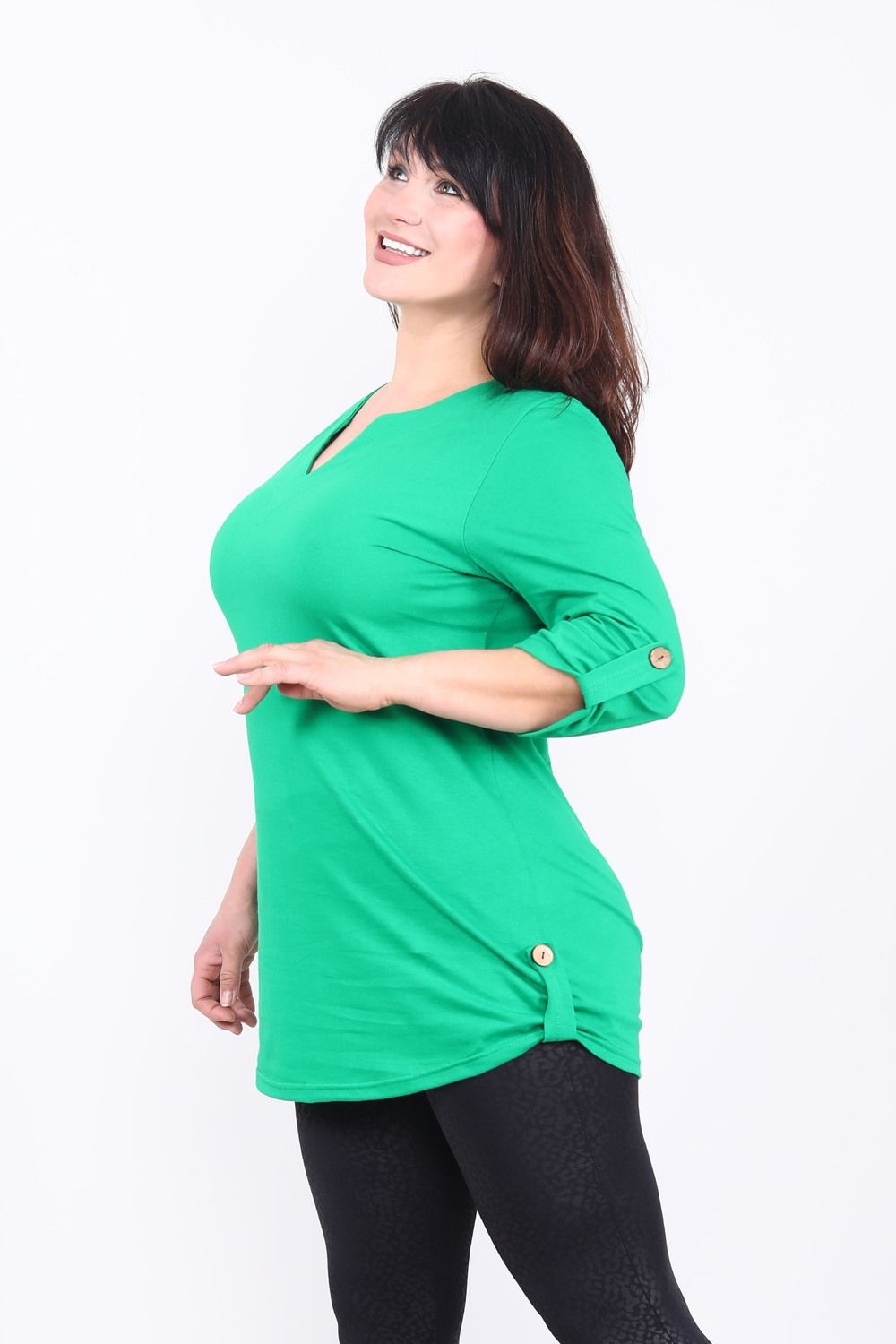 Туника женская с рукавом 3/4. Данная модель выполнена из трикотажного полотна кулирка (хлопок 100%). Горловина обработана обтачкой. Низ изделия округлый. По бокам изделия и внизу на рукавах присутствуют хлястики с пуговками. Отличная модель для отдыха и прогулок.