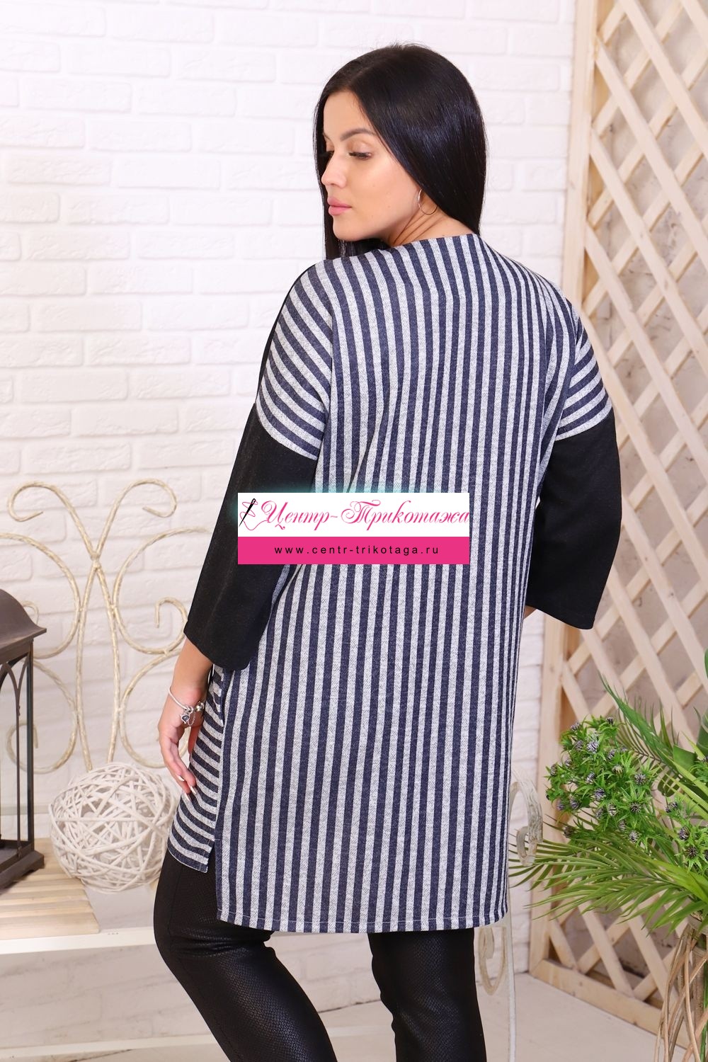 Туника прямого кроя. Плечо спущенное, рукав 3/4. Округлая горловина. На полочке кокетка из однотонной ткани с декоративными стразами. В бок изделия вшита декоративная тесьма. Перед туники короче спинки, по бокам изделия разрезы.